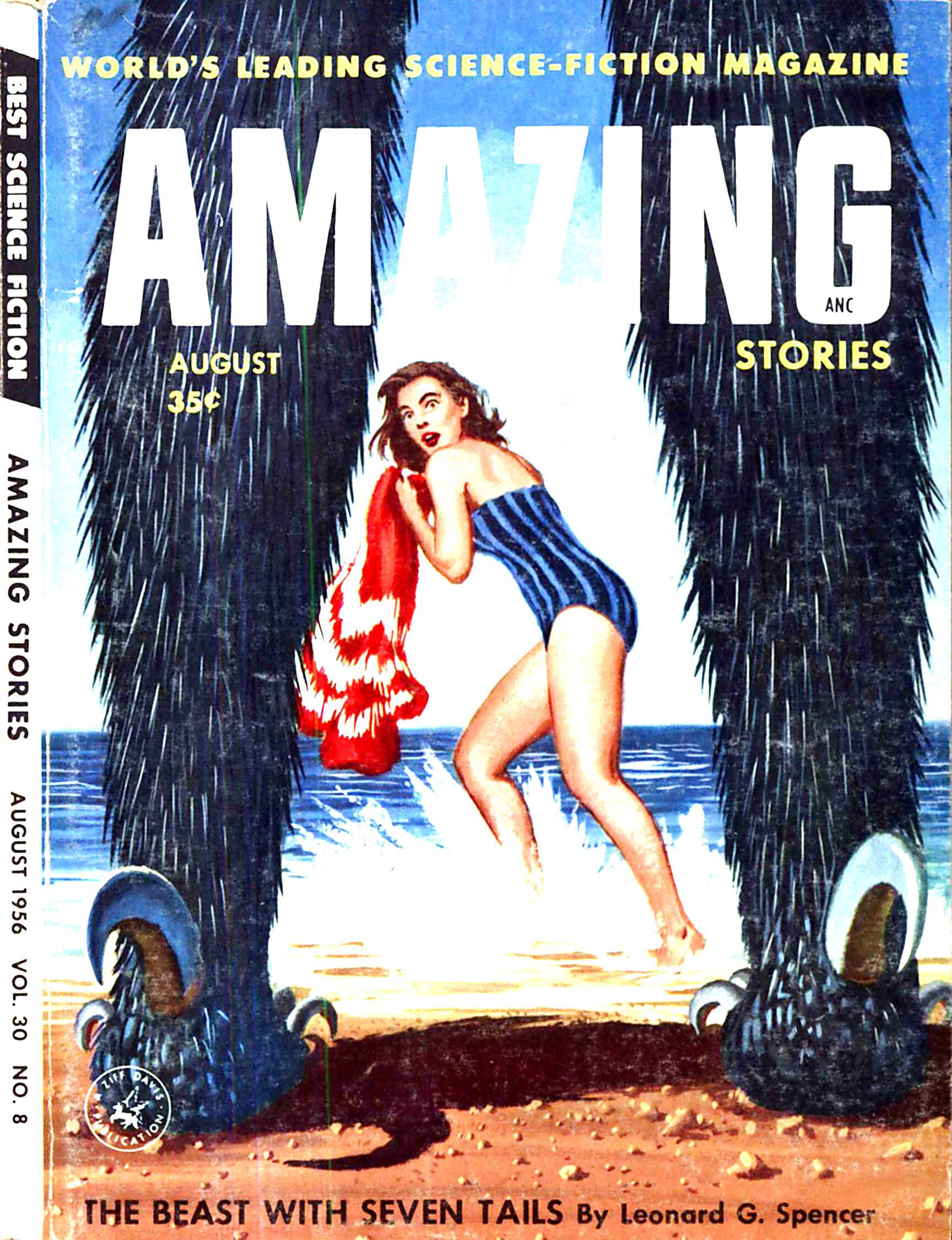"content": "Amazing Stories vol. 30, no. 8 (August 1956)\n\nLove the composition. Never show your monster too soon, keep people guessing. Bit disappointed that it apparently has seven tails but not even a hint of a tail in the image.\n\nOriginal magazine: https://archive.org/details/Amazing_Stories_v30n08_1956-08_cape1736\n\n#Magazine #MagazineCover #PulpMagazine #PulpFiction #ScienceFiction #Fantasy #Horror #Art #Illustration\nhttps://cdn.masto.host/zirkus/media_attachments/files/116/236/309/258/506/447/original/d239d2d3e5d9b2fa.jpg\n",