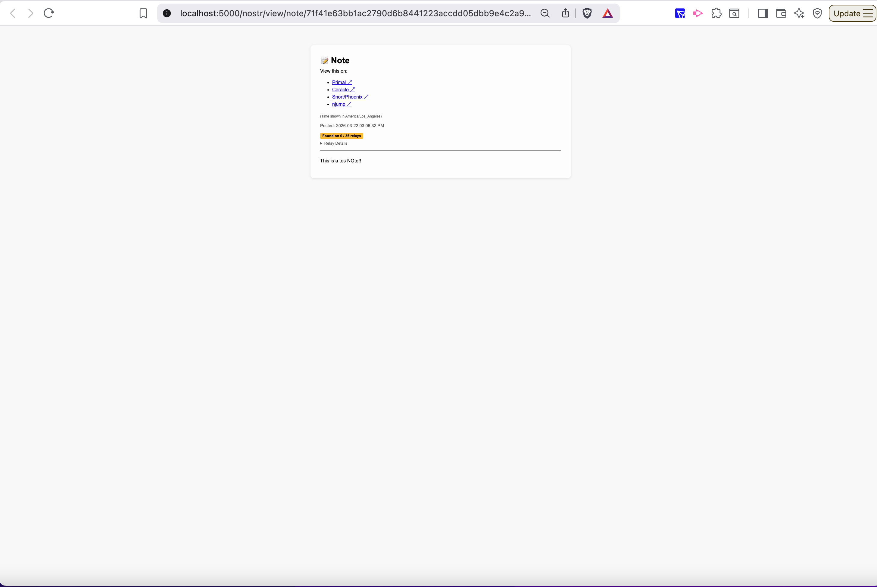 Below are 5 screens showing the full flow — from writing a note locally to seeing it appear in another Nostr client.