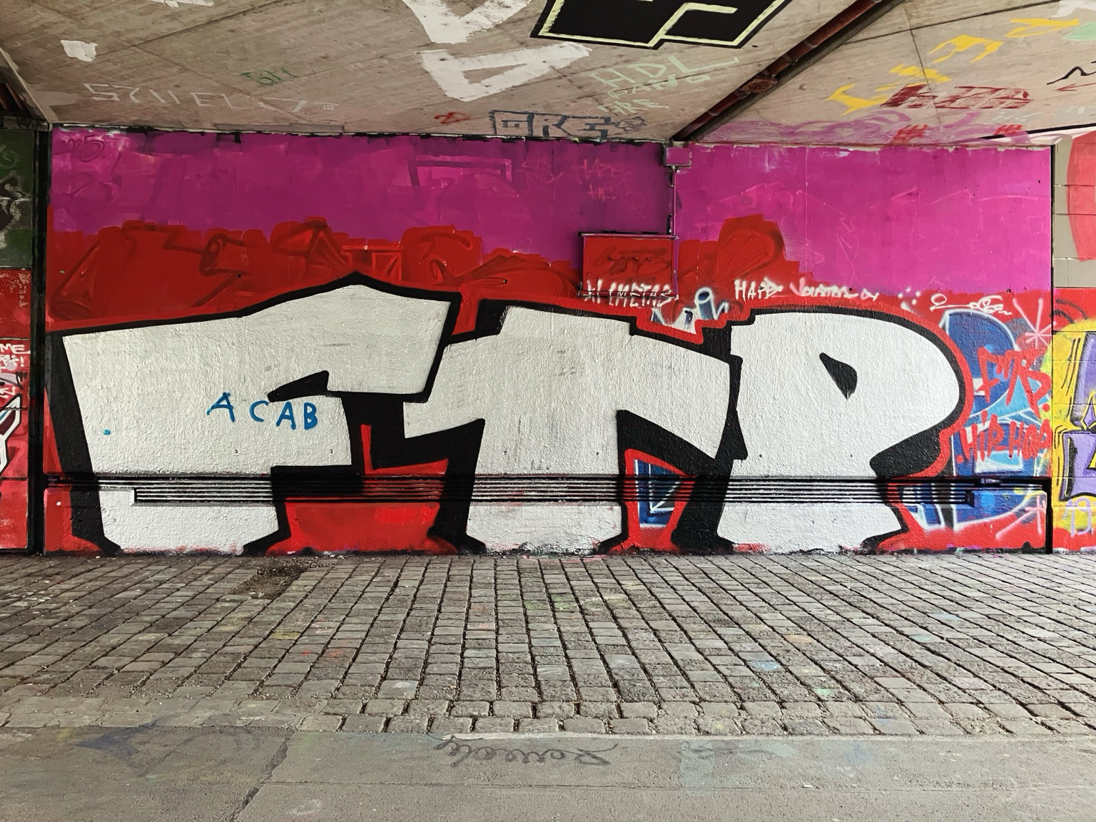 quotingOne could read “double trouble” in this enormous example of graffiti, sprayed with bold precision on a walkway wall under an overpass in Vienna: both #FTP (fuck the police) and #ACAB (all cops are bastards/bad)—aka, cops always bring trouble, they don’t protect or defend people from it. And that’s a good and legit read, pointing in two acronyms or seven letters to the countless reasons why police must be abolished. Reform just paints a lighter shade of blue on the inherent brutality of policing.