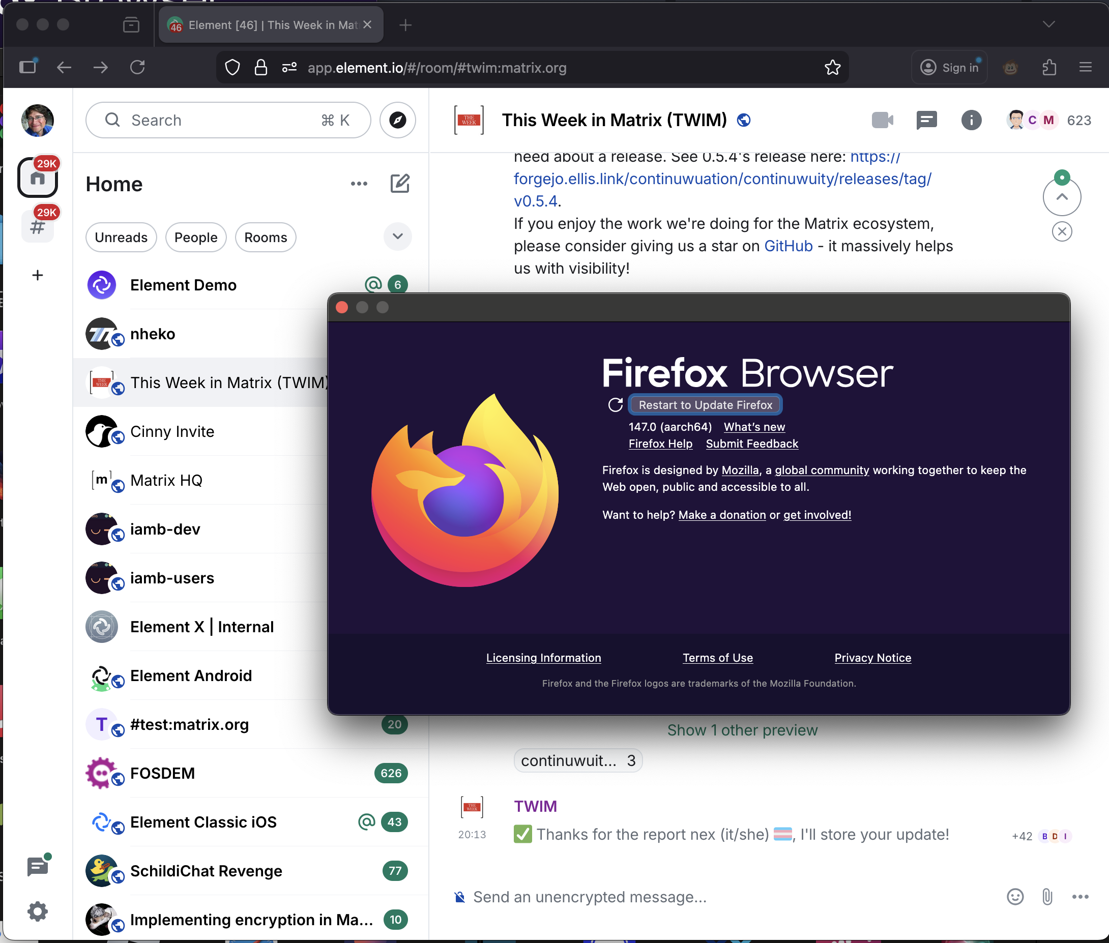 no idea; 147.0 works fine here, and without knowing what platform you're on or what extensions you have installed, or what version of Element you're using, there's not much we can do. Have fun on XMPP!