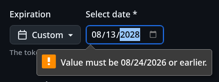 Good morning to everyone except GitHub, which:<li><p>allows (but strongly discourages) fine-grained access tokens with no expiration date, but</p></li><li><p>won't let you create one with an expiration date more than one year out.</p></li>