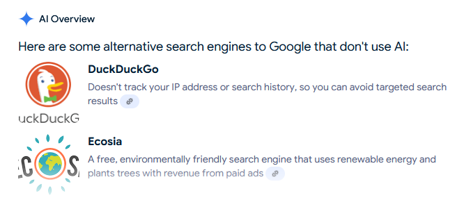 "content": "So now that google insists that we receive their AI garbage every freaking time we search... what alternatives do people recommend? I did google it and their AI suggested duck-duck-go and Ecosia which I guess I'll give a try. I'm dying inside.\nhttps://mediacdn.aus.social/media_attachments/files/113/428/393/774/964/024/original/a369948602b507c8.png\n",