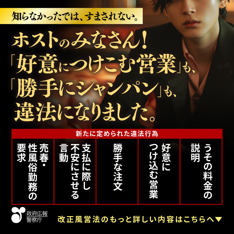 tess on Nostr: 「#ホスト ... 「#ホスト 風営法の改正により、ホストクラブなどの接待飲食営業において、新たに禁止行為などが定められました。悪質な接客は罰則の対象となる可能性があります。」https://x.com/gov_online/status/1925567335613833627 の皆さん!違法な接客していませんか?