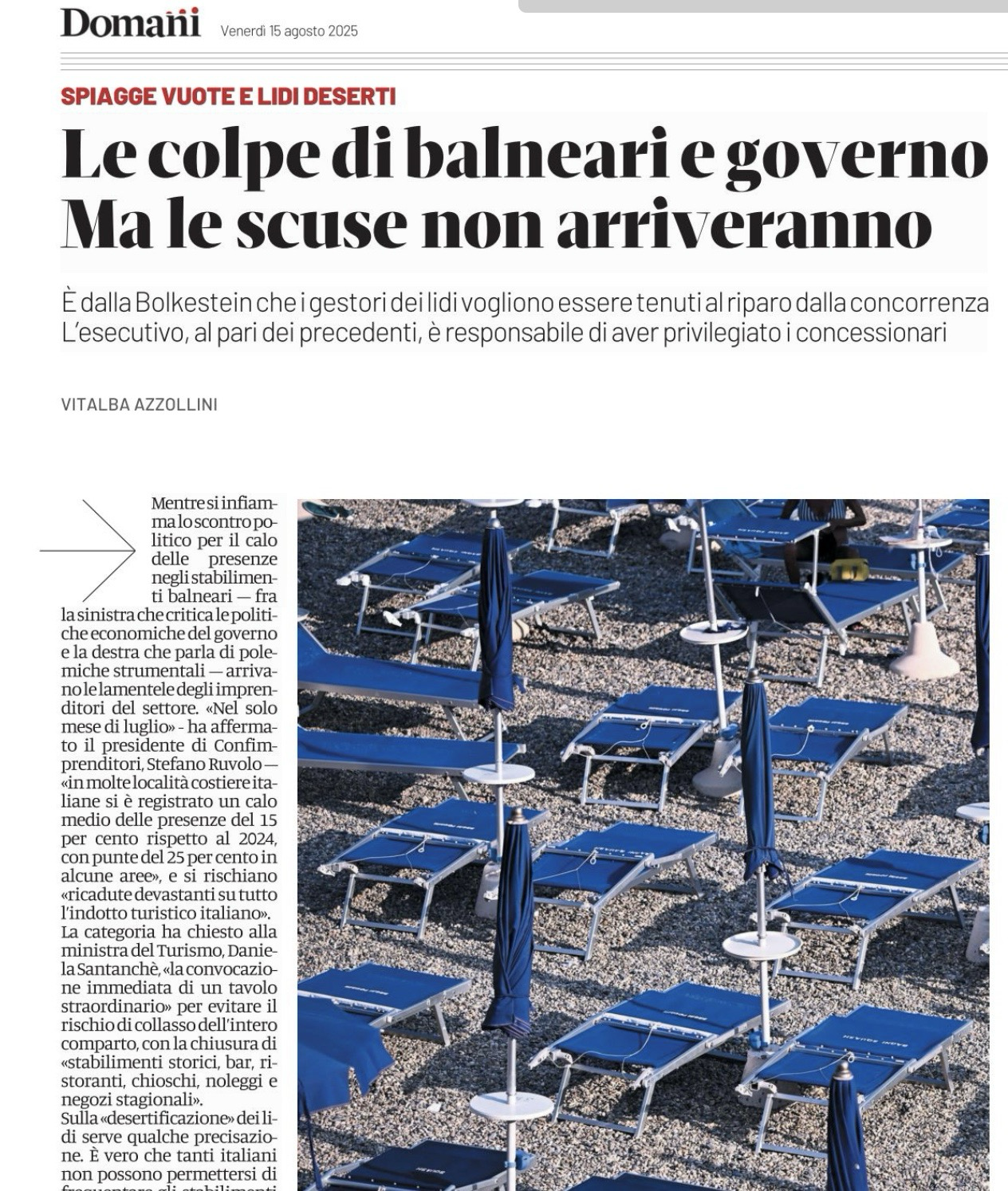 "content": "Agosto, balneare mio non ti conosco.\n\nCalano le presenze sulle spiagge, e i balneari chiedono di essere tutelati dal governo. Sarebbe meglio facessero mea culpa. Se la gente diserta i lidi è colpa loro. È anche colpa dei governi che li hanno assecondati nel mantenere rendite posizione, in assenza di gare, sottraendo risorse ai cittadini.\n\nForse ora la gente si è scocciata\n\n https://www.editorialedomani.it/fatti/balneari-governo-colpe-rendite-posizione-spiagge-vuote-scuse-non-arriveranno-odze7f2v\n\nhttps://cdn.masto.host/mastodonuno/media_attachments/files/115/031/496/705/328/129/original/2fb3dec6df143476.png",