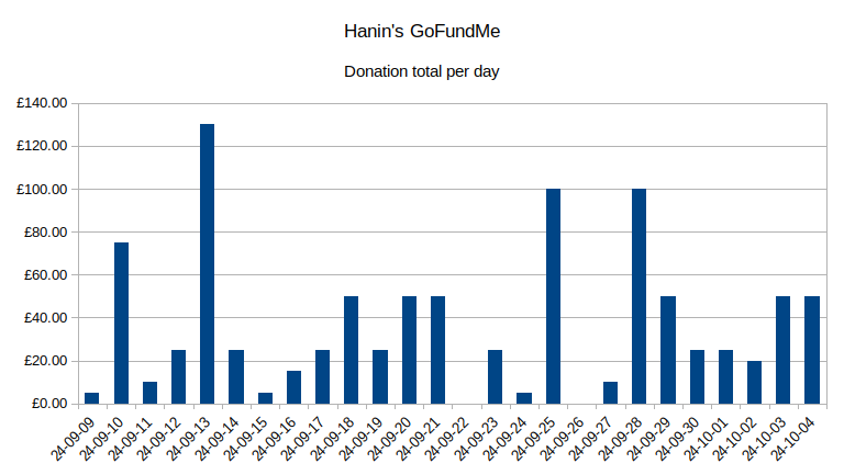 Here is a chart showing daily total donations to her GoFundMe. Every little bit helps!