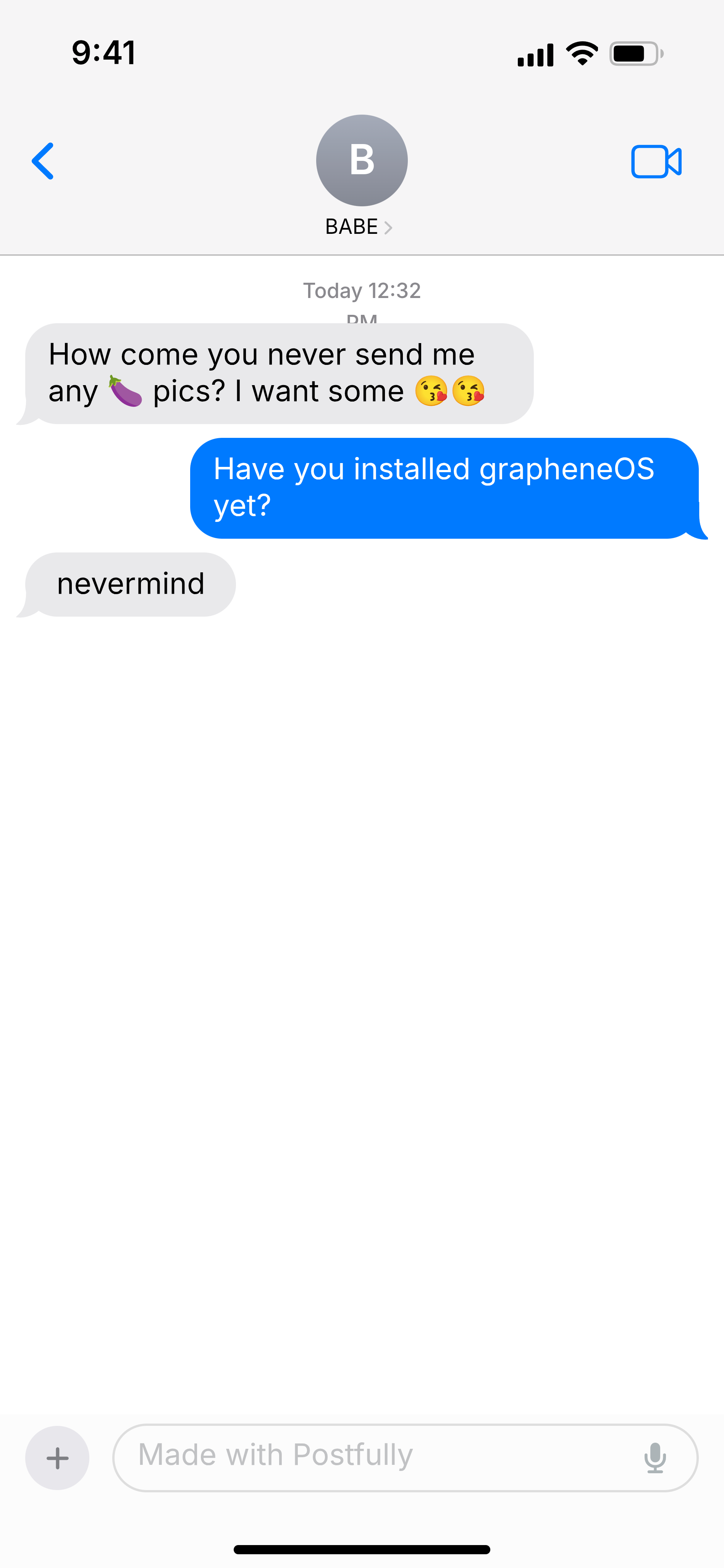 I just sent this meme to my wife's GrapheneOS phone over Signal messaging protocol.
