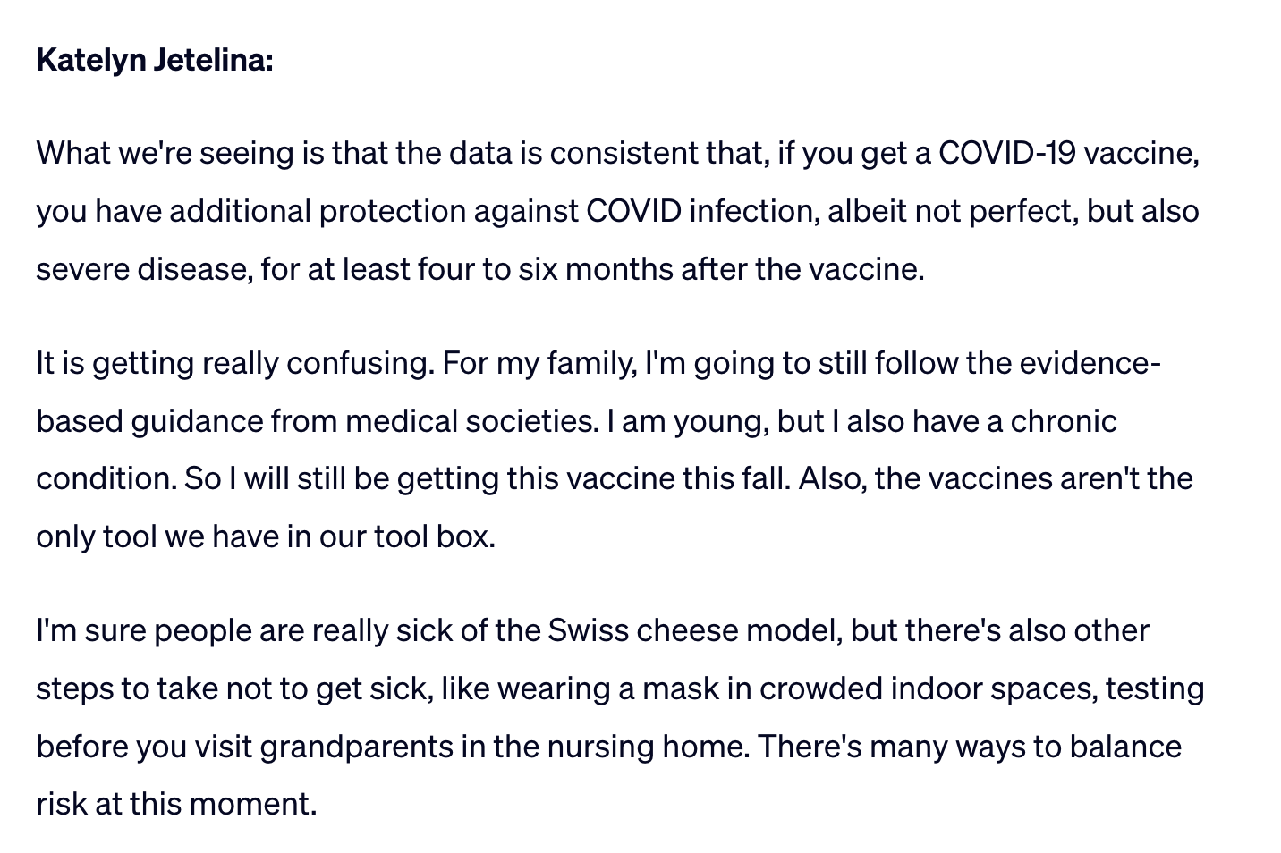 Dr. Katelyn Jetelina, : "I'm sure people are really sick of the Swiss cheese model, but there's also other steps to take not to get sick, like wearing a mask in crowded indoor spaces, testing before you visit grandparents in the nursing home."