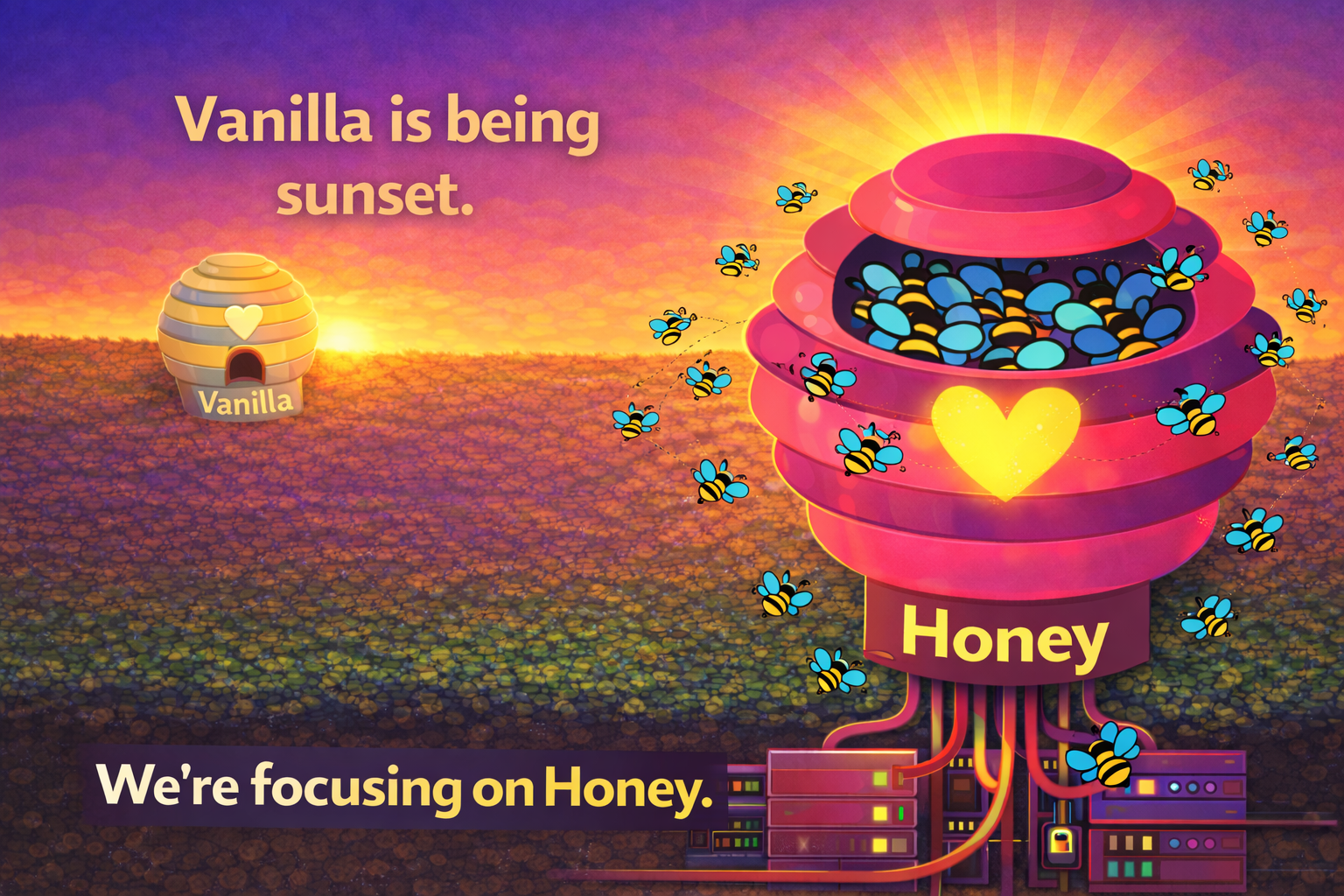 "content": "The only way to deliver the best for our community\nIs to focus on one single awesome experience.\nThank you Vanilla, we'll take the learnings to make Honey better 🐝💜\nhttps://swarm.hivetalk.org/60775c720a8c04ef80583a77de8f1fa8d6528e32915036d468301bc5894cd143.png\n",