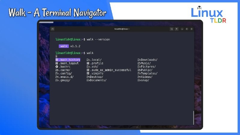 "content": "Walk: A Lightweight Terminal Navigator for Linux\nhttps://linuxtldr.com/installing-walk/\n\nhttps://noc.social/system/media_attachments/files/114/945/686/493/739/295/original/a216d07aa9119387.jpg",