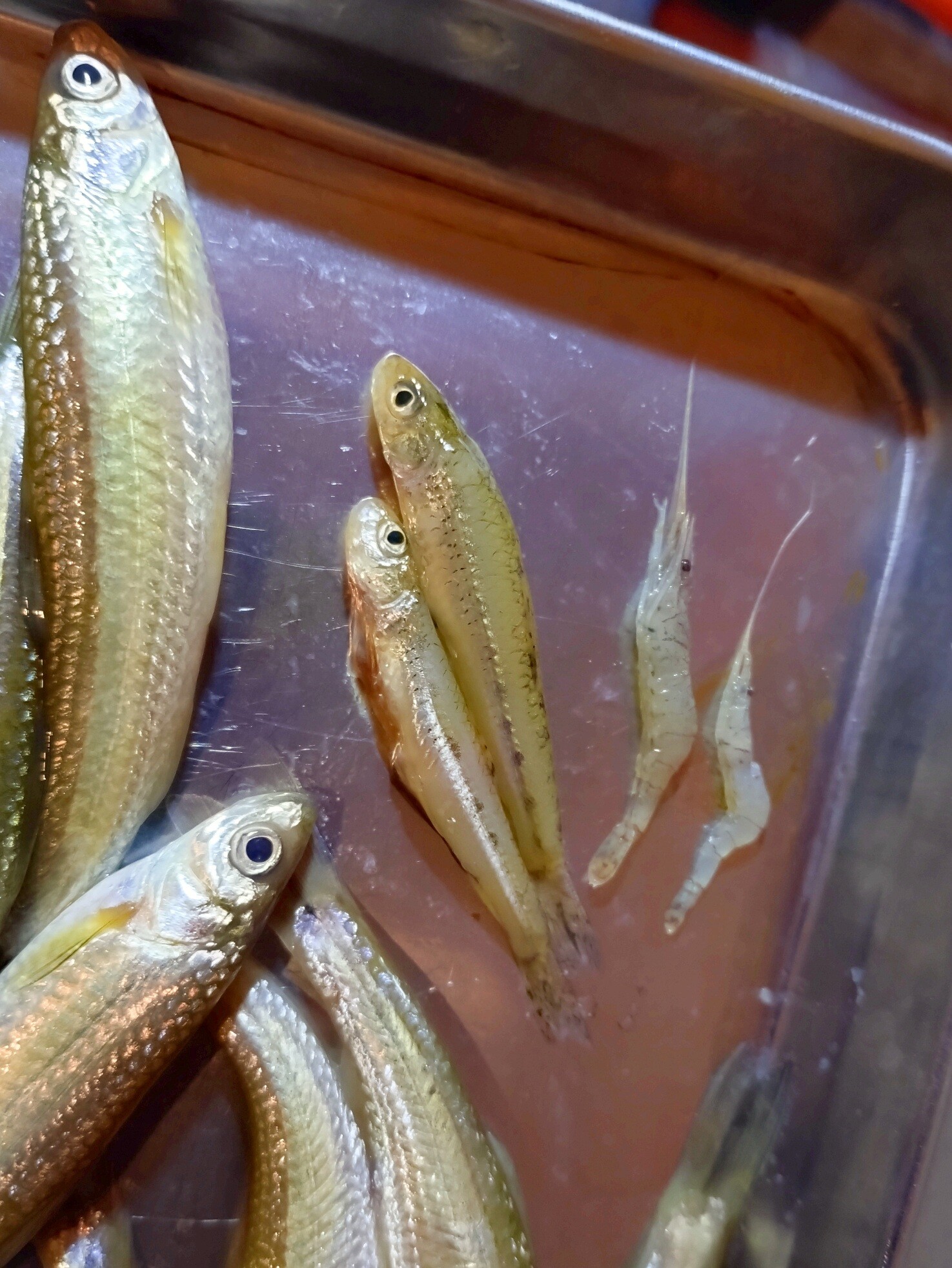 鹿,カエル,あるいは片栗粉 on Nostr: ...なお、本モロコはマッキーと比べるとこんなサイズの魚で骨も頭も食べます。数えると、1パックに本モロコ32匹エビ4匹恐らく本モロコではないなんらかの淡水魚2匹が入っていました。