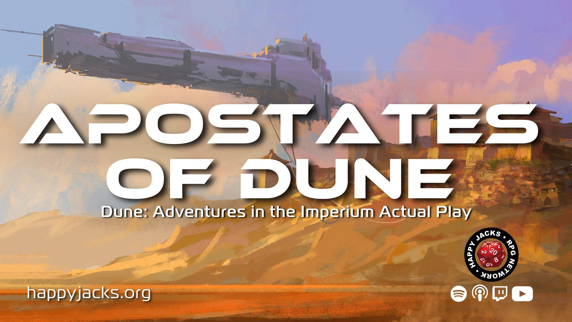 "content": "Join us live at 7 PM PST/10 PM EST for Apostates of Dune, a Dune #ttrpg #ActualPlay!\n\nFor 10,000 years, the Imperium has endured. Now the ambitious rising stars of House Lykos may have the key to remake the galactic order...if they can survive long enough to use it.\n\nhttps://www.twitch.tv/happyjacksrpg\nhttps://cdn.masto.host/dicecamp/media_attachments/files/116/399/285/737/884/766/original/29890e3463033397.jpeg\n",