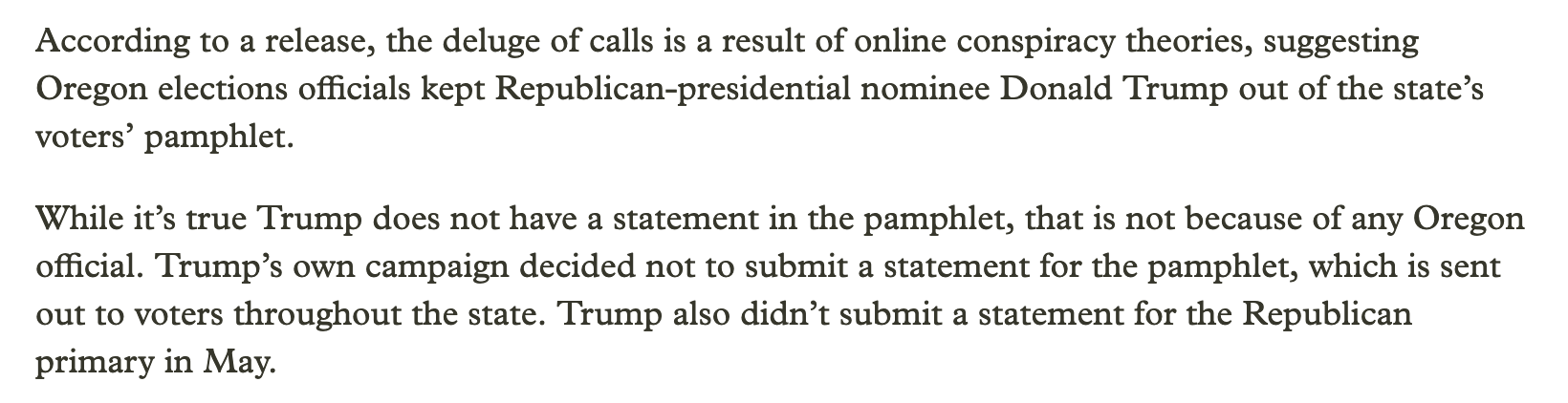 "content": "*sigh*\n\nThe Trump campaign decided not to put an item in the Oregon voter's pamphlet, which started a rumor that election officials had *prevented* Trump from being listed there, which caused a bunch of jerks to call and complain 😠\n\n\"Oregon elections phone lines closed after a flood of conspiracy calls\"\n\nhttps://www.opb.org/article/2024/10/17/oregon-elections-phone-lines-closed-after-a-flood-of-conspiracy-calls/\n\n\"the office received around 400 calls … Many of those calls were abusive, she said, while some were explicitly threatening.\"\n\n#USPol #Oregon #Election2024\nhttps://assets.disabled.social/media_attachments/files/113/342/294/883/735/833/original/f4ad75bd351c727e.png\n",