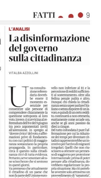 "content": "Oggi smonto alcune bufale, e una certa ipocrisia, sul referendum in tema di cittadinanza.\n\nE non per \"buonismo\", ma perché la propaganda che si sta facendo per l'astensione rischia si sommergere le argomentazioni razionali e informate. \n\nE anche perché bisogna smascherare certe attestazioni di ignoranza di chi, per far fallire il referendum, non esita a prendere in giro la gente.\n\nhttps://www.editorialedomani.it/politica/italia/la-disinformazione-del-governo-sulla-cittadinanza-ypixyill\n\nhttps://cdn.masto.host/mastodonuno/media_attachments/files/114/555/780/766/035/356/original/3863d3b261c0ada5.jpeg",