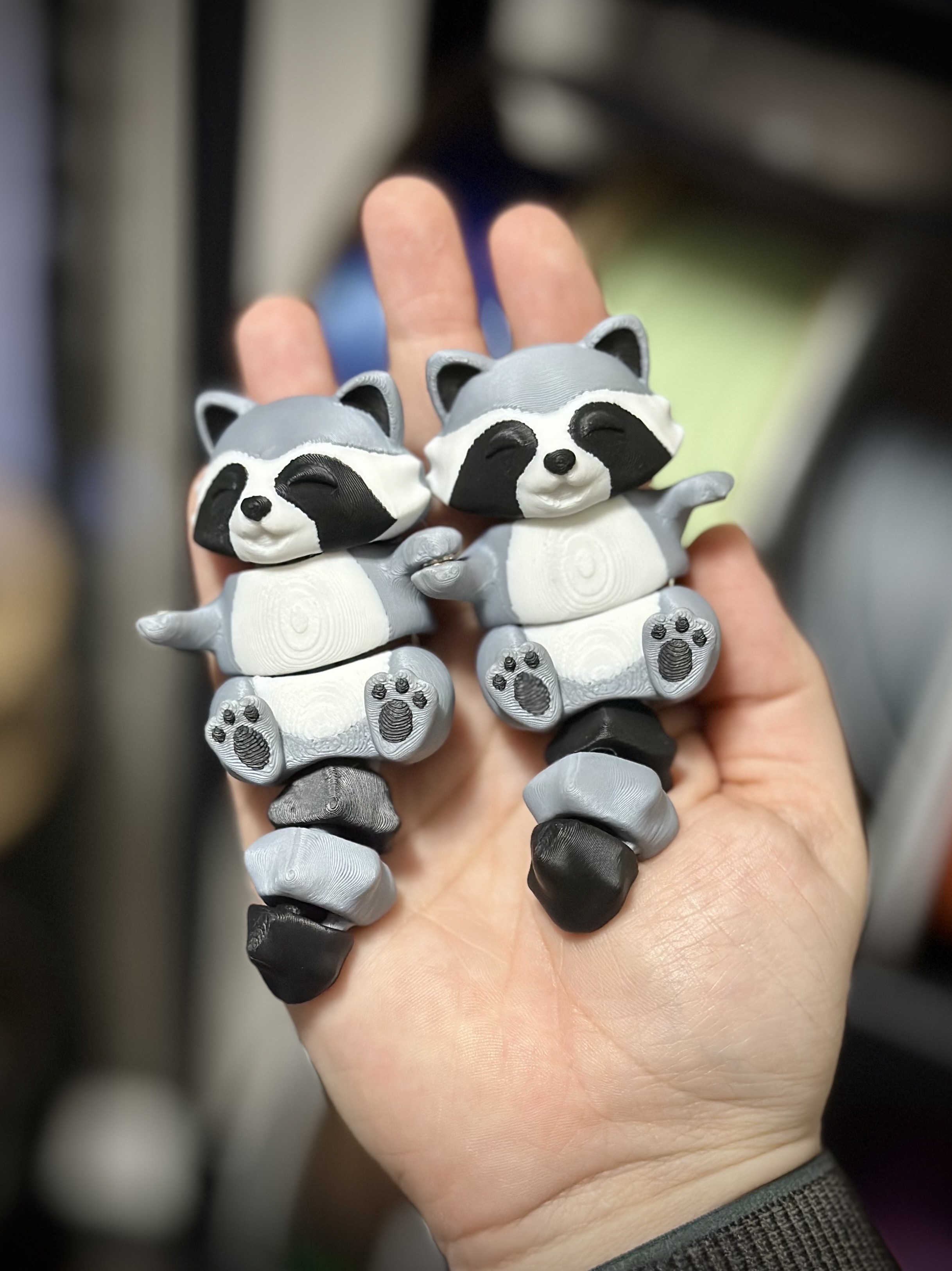 "content": "Yes. They’re trash pandas. \nYes. They’re holding hands. \nYes. They’re magnetic. \nYes. They articulate. \nYes. There is also an available magnetic trash can for them to hold onto. \nYes. They’re 10000% adorable! \n\nI’ve got these lil ones and other unique flexi animals coming to the shop soon! 🤓💕\n\n#BrittBuilds3D\n\nhttps://mstdn.games/system/media_attachments/files/115/594/863/162/622/068/original/6c6ae754b5b968af.jpeg",