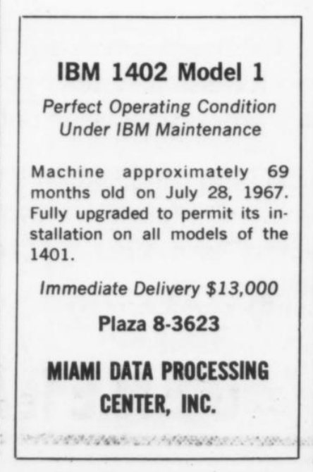 "content": "The other thread about Computerworld is upsetting, so here's a new one.\n\nSlightly used IBM 1402 for $13,000 ($125,737 inflation-adjusted). Sounds like a good deal to me\n\n(Edit: not 1401!)\n\nhttps://media.tech.lgbt/media_attachments/files/115/083/662/987/579/374/original/34916b47aa0f7b46.png",