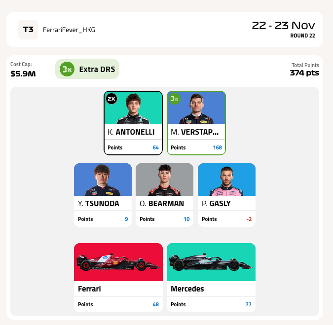 "content": "If only I made the same choices in my Team 1 as my Team 3!!!! I guess almost everybody got burned by the Mclaren double DSQ. My Team 1: VER(x2), RUS, GAS, LAW, BEA + MCL, MER only got 192 points.\n\n#F1 #f1fantasy #fedif1league #formula1 #grandprix\nhttps://cdn.fosstodon.org/media_attachments/files/115/602/150/946/331/822/original/ea5ea9150d14b2d6.png\n",
