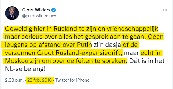 In 2018 ging Wilders op bezoek in Moskou. Vlak nadat het onderzoeksteam MH17 bekend maakte dat het onomstotelijk vast stond dat Rusland schuldig is aan het neerhalen MH17. Wie Wilders ging bezoeken wou hij niet zeggen. Voor mij is duidelijk dat Wilders net als alle andere populisten in Europa wordt gefinancierd door Rusland om rotzooi te trappen en om verdeeldheid te zaaien.