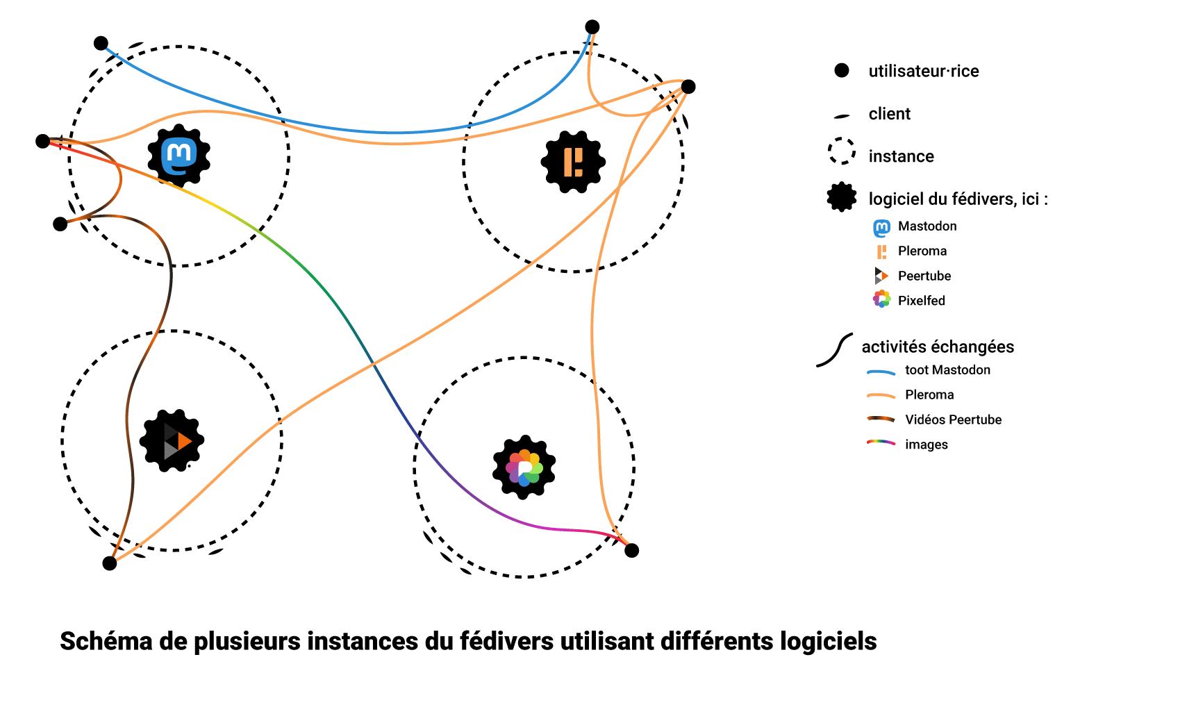 Pour parler entre elles, les différentes version du logiciel de réseau social libre utilisent le même protocole. Sur nos schémas, nous prenons l'exemple des logiciels du fédivers dont le protocole est ActivityPub (mais il en existe plein d'autres !)