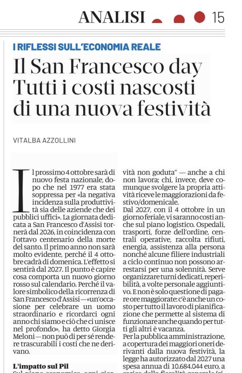 "content": "La nuova festività nazionale di San Francesco ha un indubbio valore simbolico. Ma qualcuno ha valutato i costi che essa comporta in termini di riduzione di Pil e oneri a caso delle imprese private (per la P.A. sono già stati stimati quasi 11 mln solo per il primo anno)?\n\nNe ho scritto oggi su Domani\n\nhttps://www.editorialedomani.it/idee/commenti/il-san-francesco-day-tutti-i-costi-nascosti-di-una-nuova-festivita-piff3x7q\n\nhttps://cdn.masto.host/mastodonuno/media_attachments/files/115/331/786/188/379/348/original/7a6e03c7051ea5a6.jpeg",