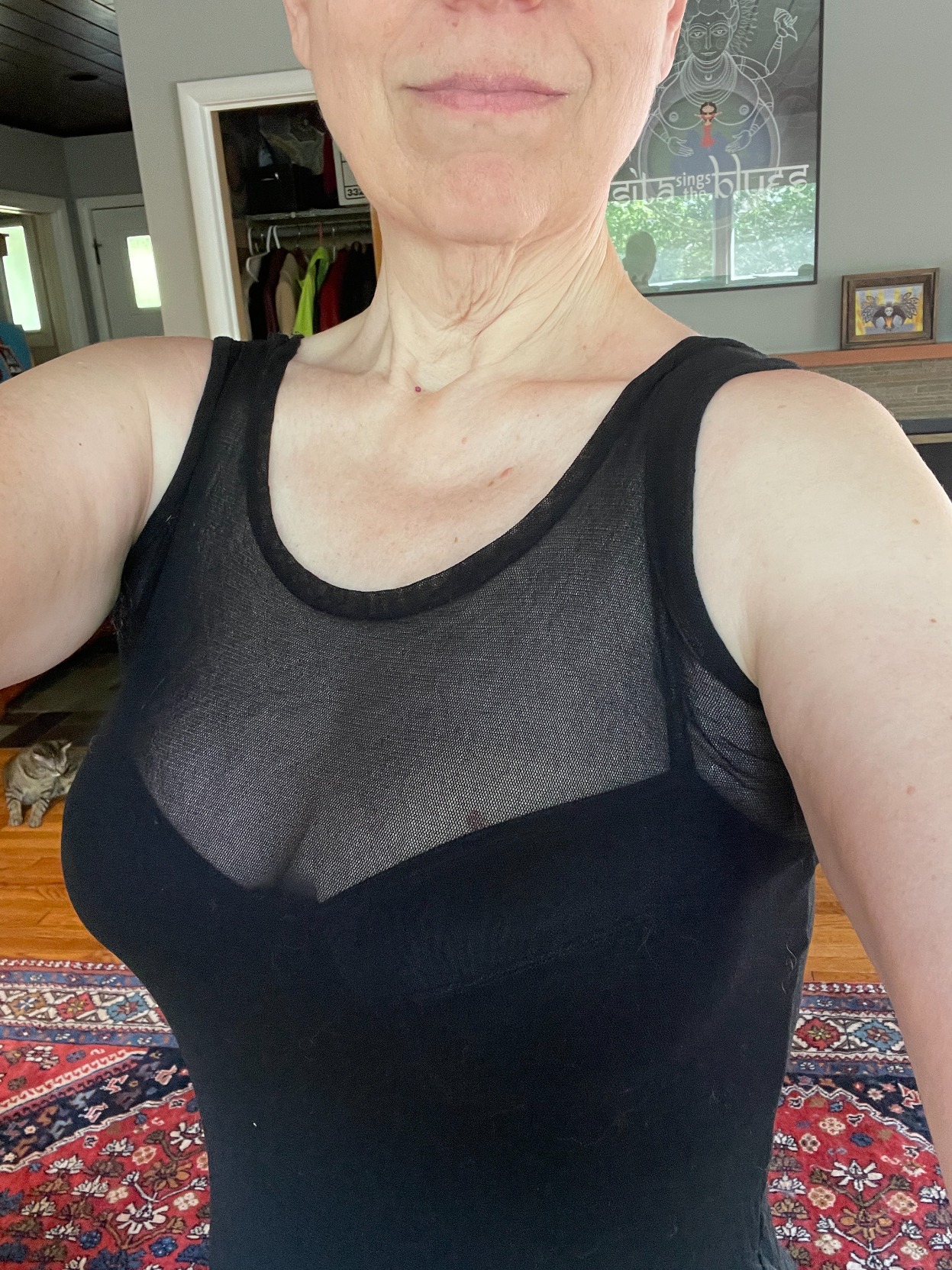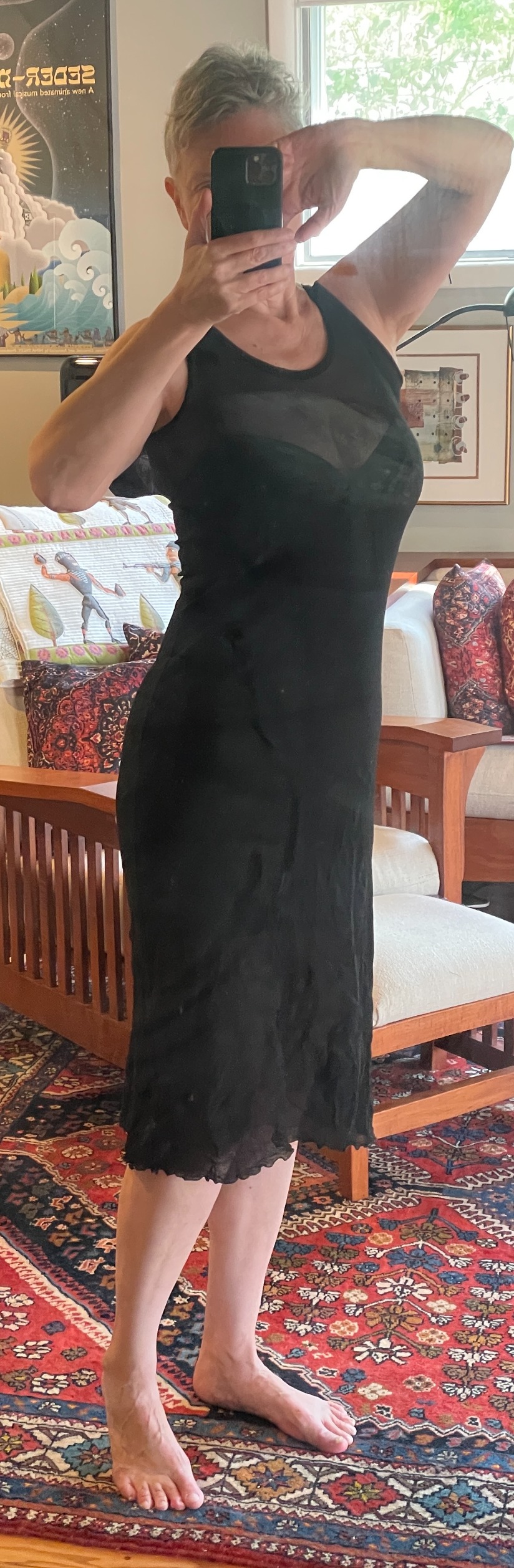 "content": "Today I excavated Ye Olde Bra Drawer, where I stash unfavorite bras and other garments I am unlikely to ever wear again. Trying everything on and finally getting rid of the stuff I really will never wear again.\nFound this Sexy Dress from about 25 years ago, San Francisco days. It still fits, but I am now an almost-58-year-old postmenopausal woman. Does cleavage go with turkey neck?\nhttps://media.spinster.xyz/812be27ae925671c61782351922ae19d626bae58fc9258b5d917908752fa891d.jpeg\nhttps://media.spinster.xyz/d6a8c1ed6afd0f229b8f1502a352217ac7f9b154c51856f19244feb09d7541b6.jpeg\n",