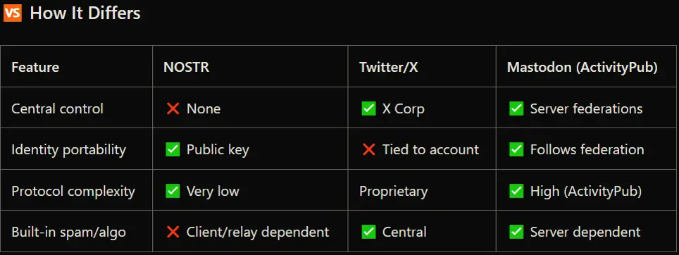 "content": "asked new agent uncensored model - what is nostr? extract\nhttps://nostpic.com/media/5e5fc1434c928bcdcba6f801859d5238341093291980fd36e33b7416393d5a2c/42e8606ffca8ca4b6133087d2671c73473bcee8e239d028722e7b2a75194053c.webp\n⚖ Pros \u0026 Cons\n\n✅ Lightweight, fast, censorship-resistant, easy to self-host relays\n✅ Works well with Bitcoin/Lightning, open standard, developer-friendly\n❌ No built-in spam filtering or ranking (relies on clients)\n❌ Evolving spec, no central entity to coordinate or enforce rules\n❌ Relay reliability varies; some charge for storage or bandwidth\n\nNOSTR is essentially a protocol for open social data, not a company or app. If you want to dive into how to generate keys, run a relay, or pick a client, just let me know!",