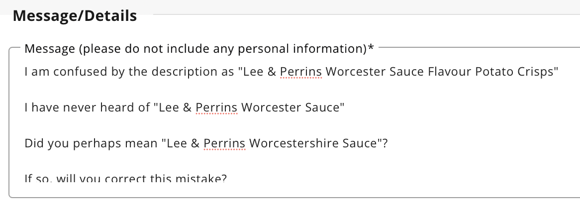 "content": "Walkers want feedback?\n\nSounds like a Trade's Descriptions issue to me.\n\nNow, if Walker’s marketing had any sense they would do a whole public apology for mislabelling as a marketing thing and cause a load of social media confusion on Worcester and Worcestershire sauce and how American’s cannot pronounce either and so on.\n\nI am ashamed at mistyping “Lee” not “Lea”\nhttps://toot.me.uk/system/media_attachments/files/114/353/906/253/361/040/original/d5dbcdc45d17a004.png\nhttps://toot.me.uk/system/media_attachments/files/114/353/906/389/776/700/original/fd9e1c9f4e820bf6.png\n",