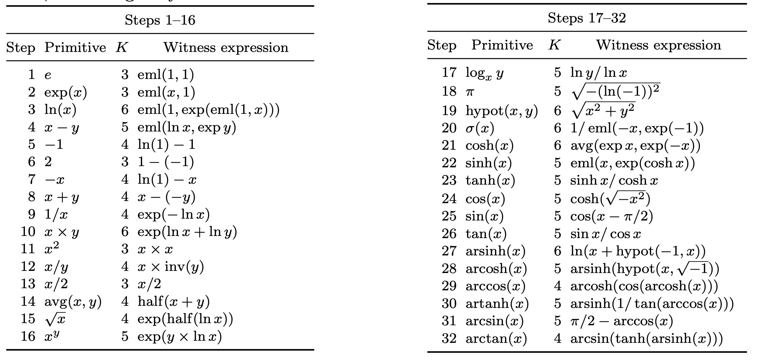 "content": "This is so cool! Given only the \"exponential minus log\" function, elm(x,y)=exp(x)-ln(y), and the constant 1, you can perform +, -, x, ÷, exp, ln, trig, powers, roots, etc. You can also obtain e and π! See https://arxiv.org/pdf/2603.21852 and https://arxiv.org/src/2603.21852v2/anc/SupplementaryInformation.pdf\nhttps://media.mathstodon.xyz/media_attachments/files/116/400/241/349/939/463/original/9e2c80c41343ecea.png\n",