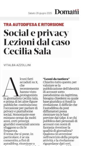"content": "Social e privacy.\n\nSi possono divulgare dati identificativi di persone che, coperte da nomi di fantasia, insultano o addirittura commettono illeciti online?\n\nL'episodio di qualche giorno fa non è stato il primo. Quindi, provo a fare chiarezza una volta per tutte.\n\nSu Domani\n\nhttps://www.editorialedomani.it/idee/commenti/social-e-privacy-lezioni-dal-caso-cecilia-sala-lu7jo5c2\n\nhttps://cdn.masto.host/mastodonuno/media_attachments/files/114/759/763/182/396/314/original/a0bc3bbf33abd860.jpeg",