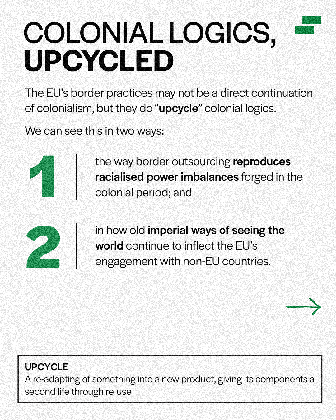 "content": "1/ As the EU pushes its borders further outside its territory, they call it \"innovative\". It's not. \n\nBy examining EU border externalisation through a post- and decolonial lens, we can see clearly how externalisation is:\n• an upcycling of colonial logics;\n• rooted in historical practices of exclusion;\n• influenced not just by European interests, but shaped with African partners and by colonial legacies; and\n• a contributor to continued racialisation and anti-Black racism in North Africa.\nhttps://s3.eu-central-2.wasabisys.com/mastodonworld/media_attachments/files/115/094/763/608/937/025/original/be772b32fe3f71ac.png\nhttps://s3.eu-central-2.wasabisys.com/mastodonworld/media_attachments/files/115/094/763/608/937/024/original/988c7470ce0c3cac.png\nhttps://s3.eu-central-2.wasabisys.com/mastodonworld/media_attachments/files/115/094/763/614/295/494/original/af2a4402201f89b1.png\nhttps://s3.eu-central-2.wasabisys.com/mastodonworld/media_attachments/files/115/094/763/607/710/765/original/f37edaec433f57b3.png\n",