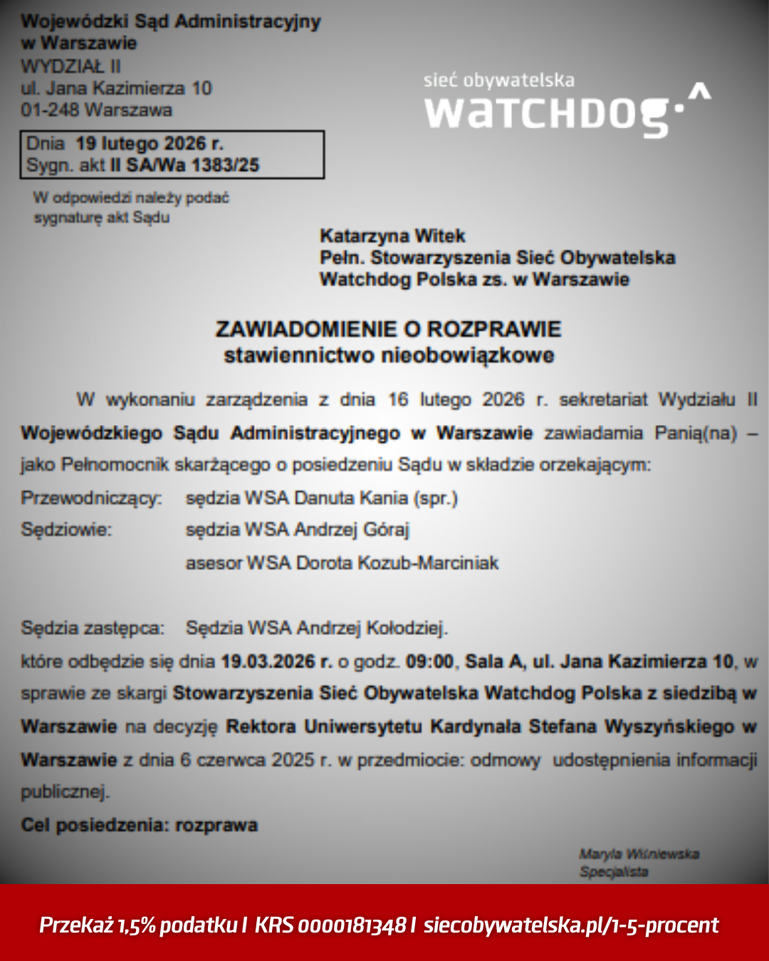 "content": "Dziś rozprawa ws. „tajnego projektu o jawności” UKSW. Od 10 lat czekamy na udostępnienie informacji na temat finansowania z publicznych pieniędzy projektu realizowanego przez Uniwersytet Kardynała Wyszyńskiego. Dotyczył on … prawa do informacji. Trzymajcie kciuki. Więcej o sprawie na stronie: https://siecobywatelska.pl/tajny-projekt-o-jawnosci/\nhttps://pcdn.mastodon.com.pl/media_attachments/files/116/254/613/410/704/161/original/26cb14ed6e4b8cc6.png\n",