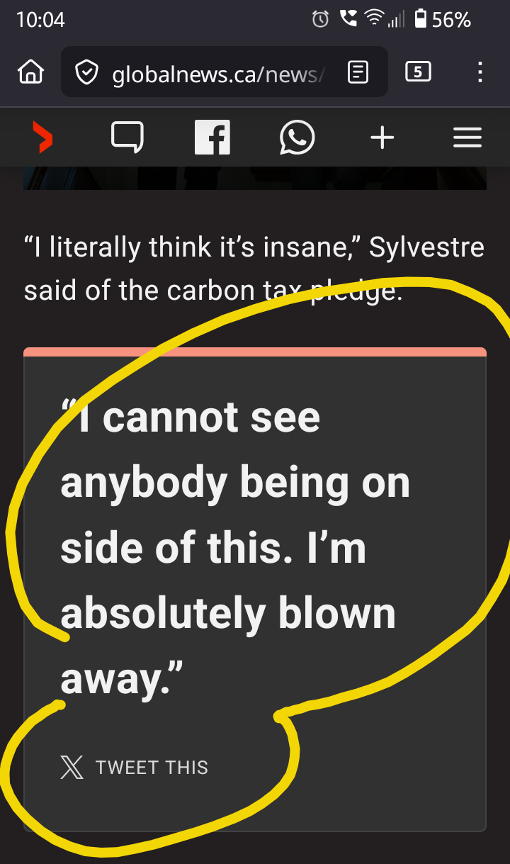 "content": "The Oil industry control of the news in Canada is total and complete.\n\nIn a story about the new Carney Smith pipeline, Global News does some of the most immediate (and shame filled) political organising ever.\n\nThey insert into the story itself bold harsh messages to post on twitter rhe Nazi weapon.\n\nImagine having such tools to bias the news story, but then ALSO to use it with these tools?\n\nOil bosses control 🇨🇦 news 👇\n\nWe deserve better. Quislings\n\n#cdnpoli #global #climate #canada\nhttps://media.mstdn.social/media_attachments/files/115/633/494/782/231/122/original/0bce5c5c5d091ed4.png\nhttps://media.mstdn.social/media_attachments/files/115/633/497/746/795/514/original/6412af0bbc51e24f.png\n",