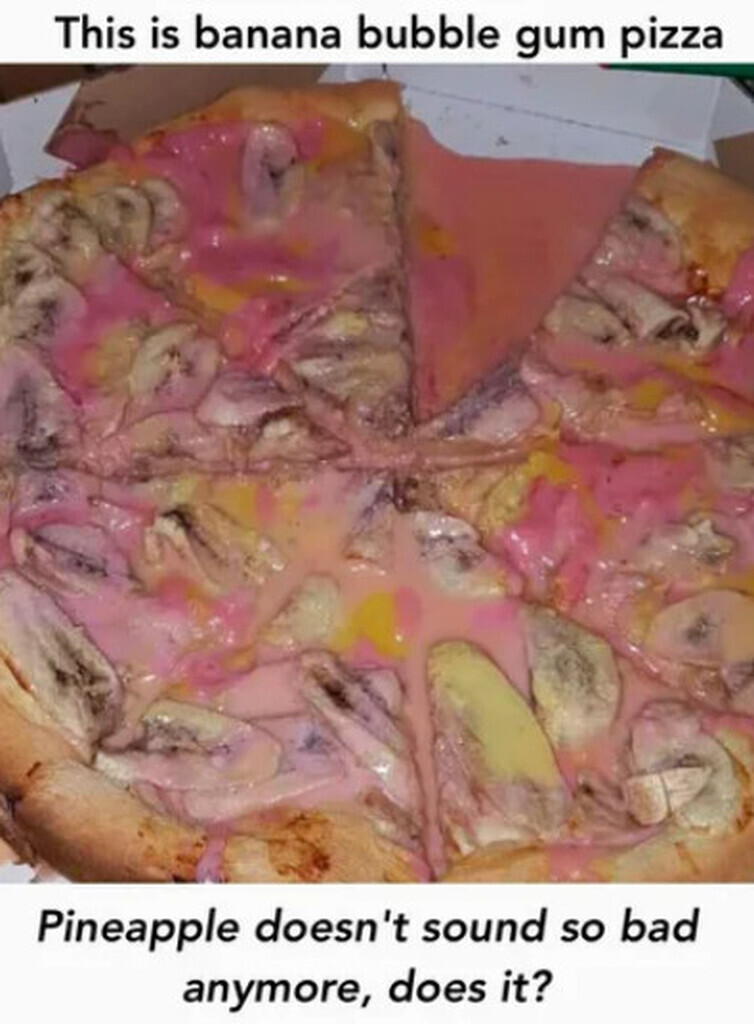 "content": "I LOVE pineapple, bacon, ham, green peppers and sausage on pizza! It's EVEN BETTER with a BBQ sauce instead of regular pizza sauce --- you need to try it today.\nhttps://cdn.minds.com/fs/v1/thumbnail/1779667358680354816/xlarge/\n",