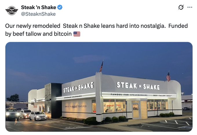 "content": "Steak ‘n Shake says its remodeled diners are “funded by #bitcoin and beef tallow.”\n\nhttps://cascdr-chads-stay-winning.nyc3.digitaloceanspaces.com/jamie-pro/226249/uploads/1756483406654-Gzhs-ehXQAEWxC_.jpg\n\nShared via https://pullthatupjamie.ai",