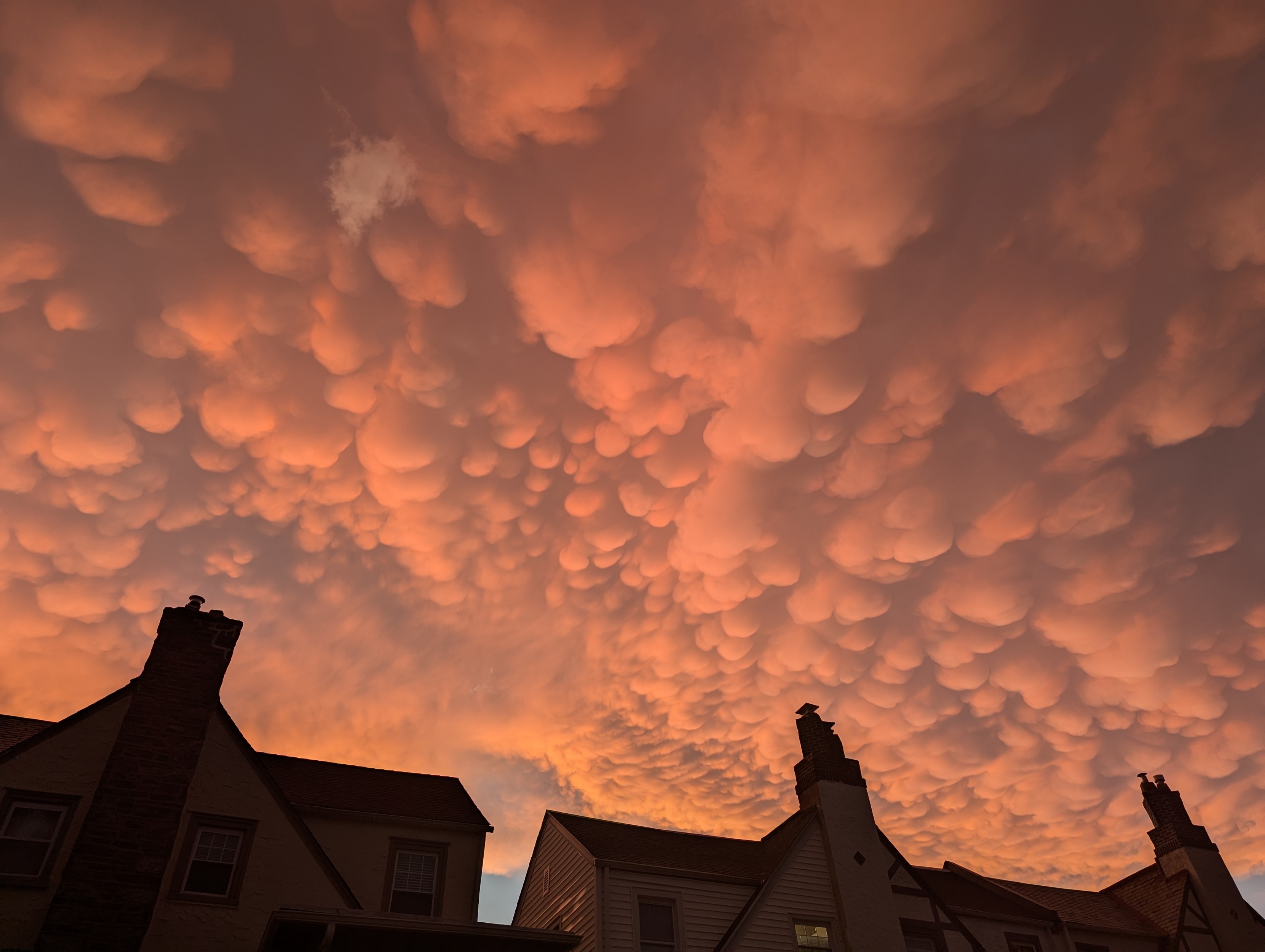 "content": "I think this is my best photo of the #mammatus #clouds from last night: https://en.wikipedia.org/wiki/Mammatus_cloud\n\nIt was interesting how my phone camera couldn't decide what color the sky could be, with each picture coming out with a very different color scheme. It reminded me of how difficult it was to photograph the wildfire smoke previously. This photo was close to what my eyes saw, no filter.\nhttps://cdn.masto.host/jawnsclub/media_attachments/files/112/710/650/291/810/693/original/150ed74e655c9606.jpg\n",