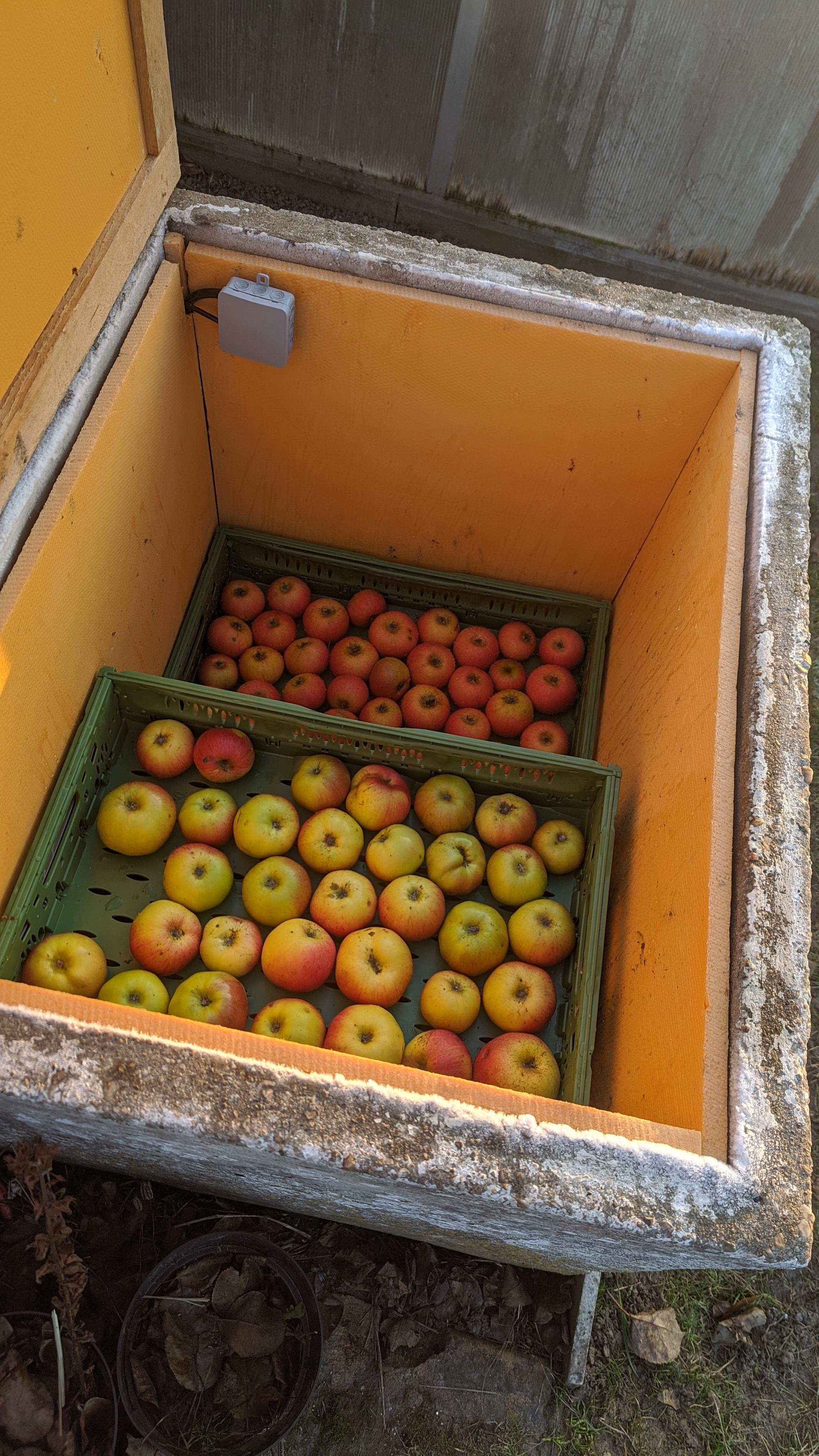 "content": "Ich mag es sehr, wenn Pläne funktionieren, gerade wenn man aus bestehenden mal eben schnell was basteln muss.\n\nIch hatte ja vor ein paar Wochen schon geschrieben, dass wir den vorhandenen Wassertrog zum Apfellager gemacht haben und ich dafür eine Frostsicherung aka Fußbodenheizung im Sandbett da drin installiert habe.\n\nWir waren heute tagsüber im Garten, um zu schauen, wie es den Äpfeln geht. Letzte Nacht waren es hier in Leipzig min. -5 Grad.\n\nDie Apfelheizung hat die Temperatur im Lager auf min. 2,2 Grad gehalten und sogar auf 3,5 erwärmt.\n\nHeute nun bei Außentemperatur von ca. -2 Grad den Deckel ausgemacht. Die Innentemperatur ist direkt auf knapp Null runter gegegangen. Man muss ja auch irgendwann mal aussortieren, nicht alle halten sich.\n\nDeckel zu, die Heizung lief bereits und hat es in fünf Stunden auf 3,5 Grad geschafft, während es bis jetzt draußen immer kälter wird.\n\nAktuell sind wir außen bei knapp 7 minus, im Wassertrog bei guten drei.\n\n#Kleingarten\nhttps://media.kanoa.de/media_attachments/files/115/782/948/368/458/645/original/d32a58749e7d7359.jpg\n",