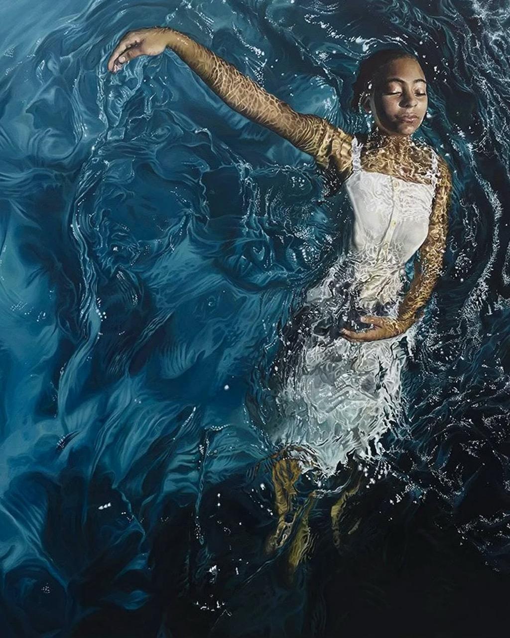 "content": "Calida Rawles, “Reflecting My Grace,” 2019,, acrylic on canvas, 84 in x 72 in. http://calidarawles.com\n\nCalida Rawles' paintings beautifully blend hyper-realism with poetic abstraction, showcasing Black bodies in vibrant underwater landscapes filled with bubbles and light. Through her use of water, Rawles explores themes of healing, history, and resilience, inviting viewers to see beyond stereotypes. 1/2\nhttps://s3.eu-central-2.wasabisys.com/mastodonworld/media_attachments/files/115/849/865/294/628/642/original/e4da8537b1a901b2.jpeg\n",