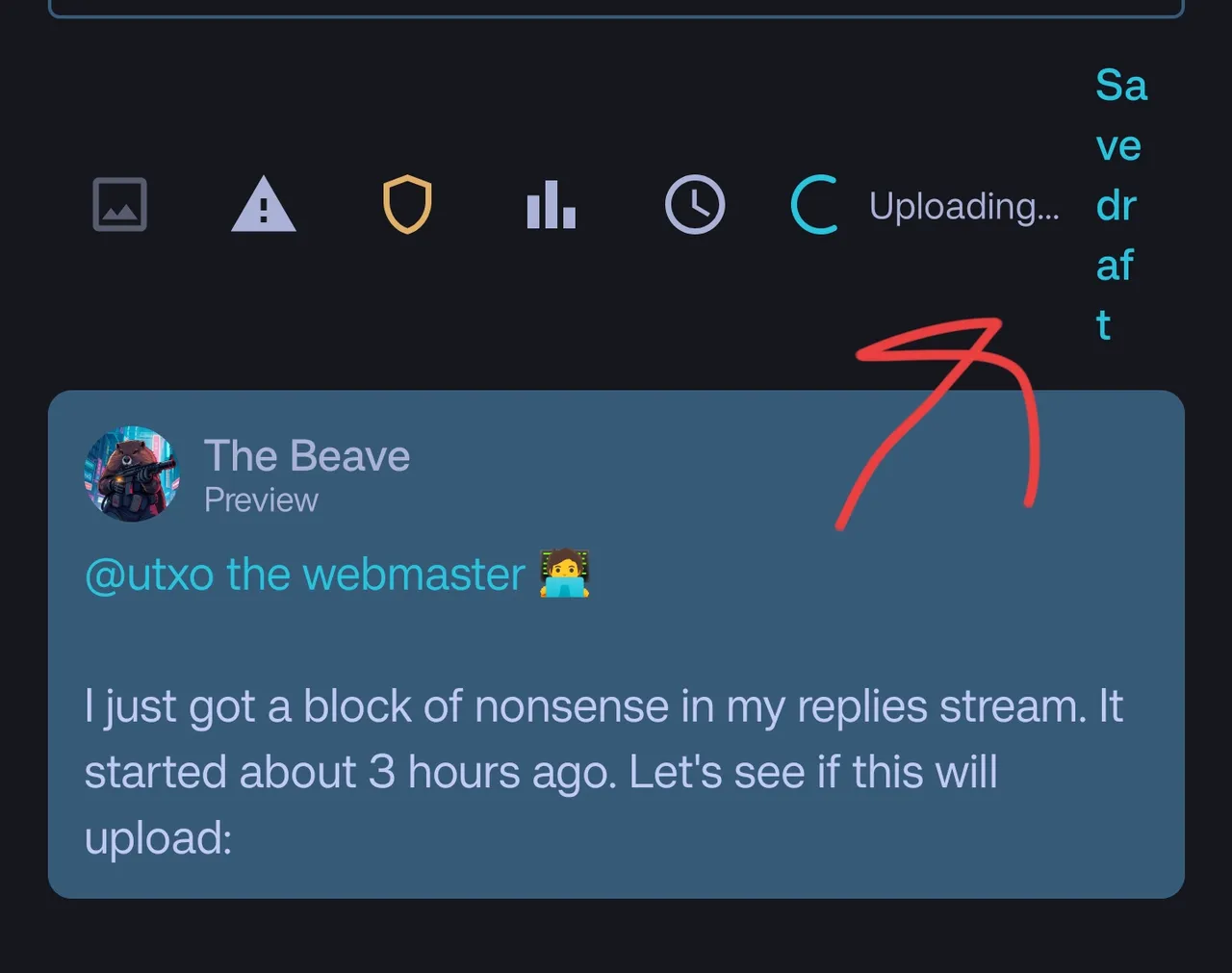 "content":"nostr:nprofile1qqsw9n8heusyq0el9f99tveg7r0rhcu9tznatuekxt764m78ymqu36csxjejf \n\nI just got a block of nonsense in my replies stream. It started about 3 hours ago. Let's see if this will upload:\n\n\nhttps://files.sovbit.host/a50d09da351ed7632942737c0efcd78cbc1329f1d4daccec03bb3d6eb6daffad.mp4\n\nAlso, when uploading, this happens:\n\n\nhttps://files.sovbit.host/4943fc7e4eb494d319744264a0040a77b0817ffb5971edf5c1f3e9e8b9a6eabc.jpeg",
