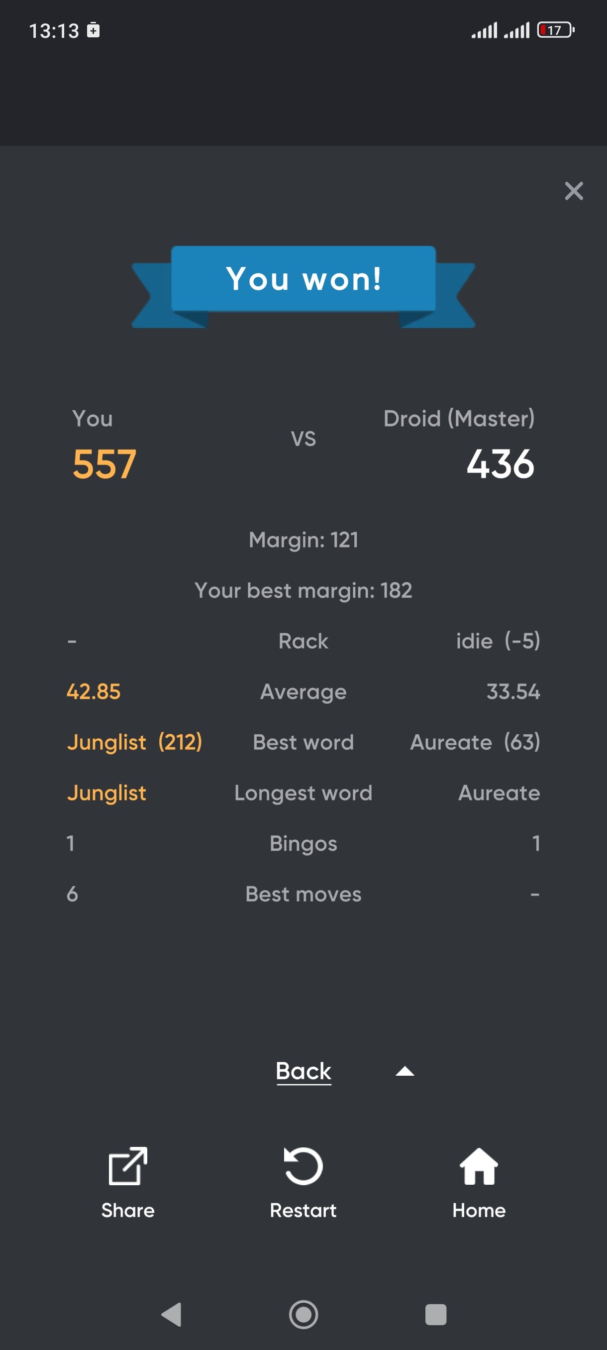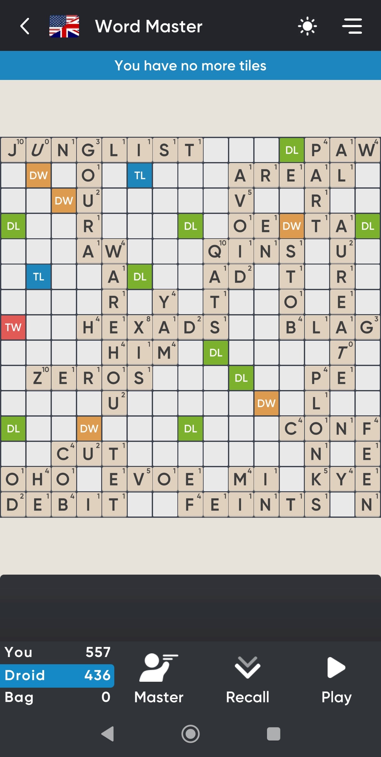 "content": "Bragging time! I miss playing scrabble with people on real boards, and the droid is always whooping my a** but once in a while I beat it. Like here, with my last tiles I played junglist, scoring 212 as it fell on two tripple words and I got a bonus. This gave me victory. (I cheated a bit. I first played jinglist and should have missed a turn when challenged, but I'm allowed to cheat the machine!)\nhttps://mograph.social/system/media_attachments/files/113/214/686/519/722/731/original/ff77991711858786.jpg\nhttps://mograph.social/system/media_attachments/files/113/214/686/870/767/058/original/854585fd31690368.jpg\n",