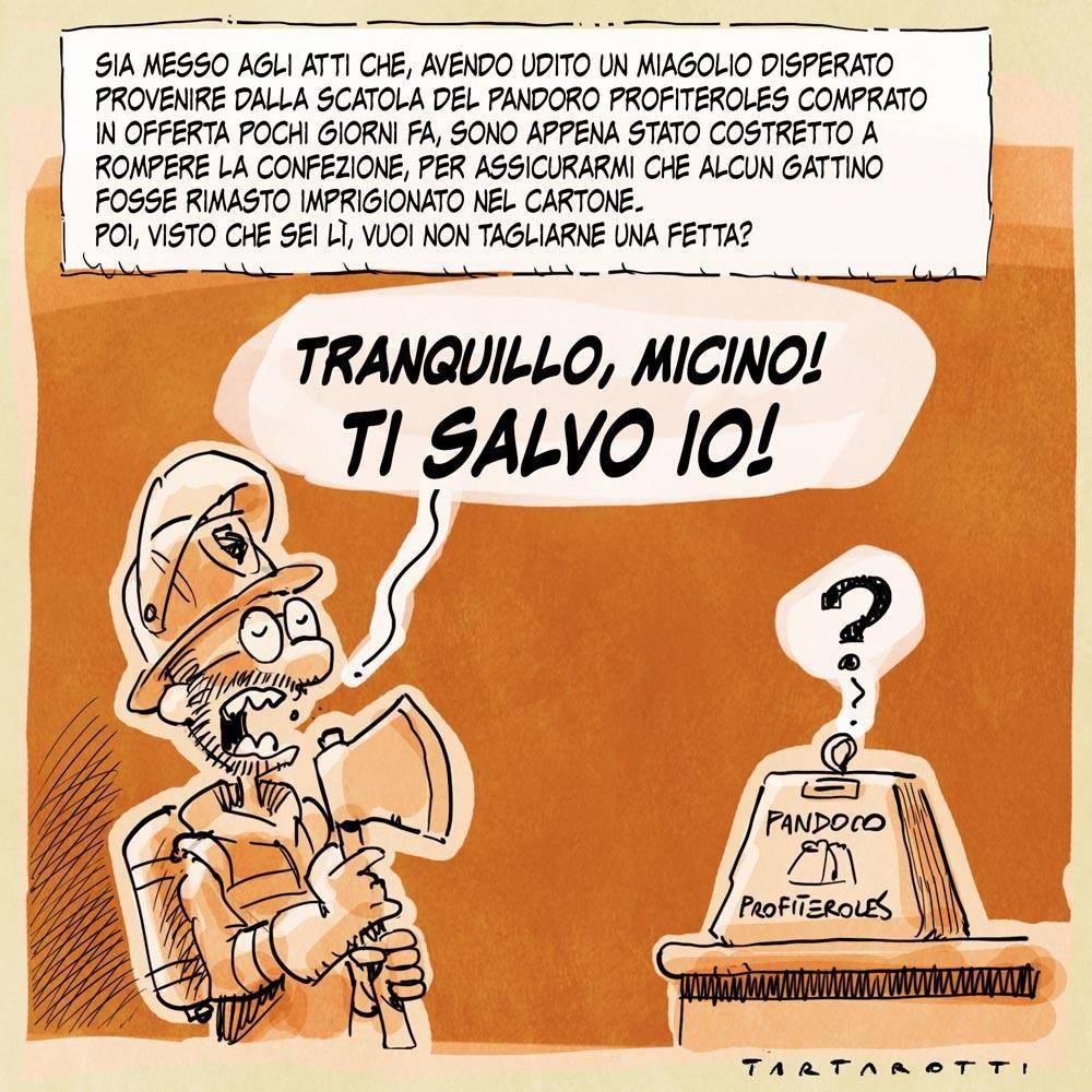 "content": "Esattamente 8 anni fa, sentendo dei miagolii venire da una confezione di pandoro profiteroles, la aprii senza perdere un momento. \nStranamente non c'erano gattini da salvare. Ma, a quel punto, vuoi non tagliare una fetta di pandoro?\nCana, hai sentito anche tu? #scuse #pandoro #megliononcorrererischi #micini #capodanno #vistochesonqui\nhttps://cdn.masto.host/mastodonuno/media_attachments/files/115/813/349/834/440/215/original/5d8013b7b9074b42.jpg\n",