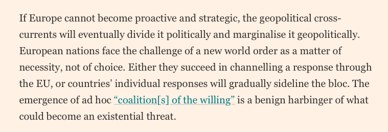 ]If Europe cannot become proactive and strategic, the geopolitical cross-currents will eventually divide it politically and marginalise it geopolitically. European nations face the challenge of a new world order as a matter of necessity, not of choice. Either they succeed in channelling a response through the EU, or countries’ individual responses will gradually sideline the bloc. The emergence of ad hoc “coalition[s] of the willing” is a benign harbinger of what could become an existential threat.[/img][/share]