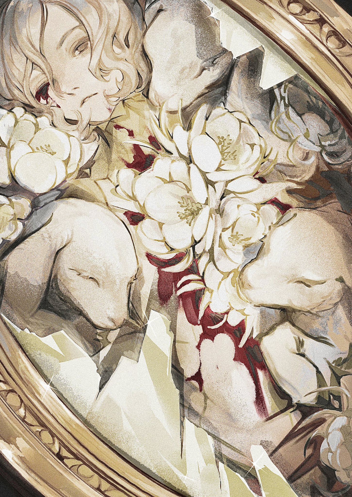 "content": "Artist: blue_let11\nTags: 1boy bags_under_eyes black_eyes bleeding blood blood_from_eyes blood_on_clothes blood_on_face blue_let11 broken_glass commentary dungeon_meshi elf flower glass goat goat_(dungeon_meshi) grey_hair hashtag-only_commentary highres injury lying male_focus missing_eye mithrun on_back parted_lips pointy_ears short_hair solo wavy_hair white_flower\nPost: https://danbooru.donmai.us/posts/8145845\n\nhttps://media.milker.cafe/c3/f5/39/c3f539f2823605cb9deb1920ad89338c15fe4ea3427392181661efb2fa78a4a4.jpg",
