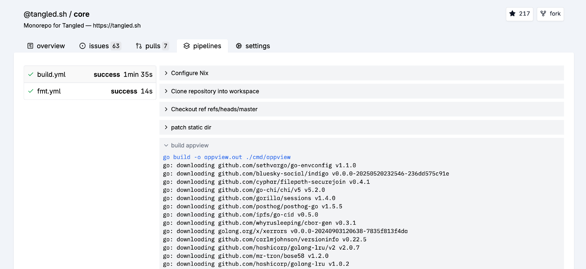 "content": "what's up tanglers‽ most of y'all probably know that we've been busy building CI, and we're finally at a stage where we can invite some users to self-host \"spindle\"—the new workflow runner—or to run builds on our hosted spindle instance. ✨\n\nfeel free to reply down below if you'd like an invite!\nhttps://oysterling.us-west.host.bsky.network/xrpc/com.atproto.sync.getBlob?did=did:plc:wshs7t2adsemcrrd4snkeqli\u0026cid=bafkreiac22u3fdwebjvttqcjpznousobv6afbvaqj6qbpousng4untxskq\n",