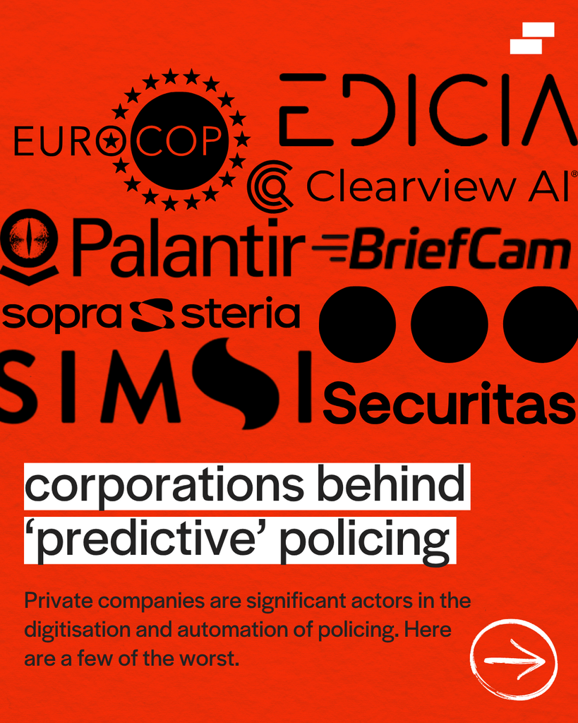 "content": "From American tech giants to Israeli surveillance firms, corporations are building—and profiting from—systems that criminalise communities.\n\nOur latest report outlines:\n• Palantir’s €2.87 billion empire built on predictive policing tools\n• Briefcam’s video AI systems, exported from Israel to EU law enforcement\n• Eurocop’s 100+ contracts with Spanish authorities\n\n📄 Learn more in our report, New Technologies, Old Injustice: https://www.statewatch.org/publications/reports-and-books/new-technology-old-injustice-data-driven-discrimination-and-profiling-in-police-and-prisons-in-europe/\nhttps://s3.eu-central-2.wasabisys.com/mastodonworld/media_attachments/files/114/896/065/101/373/134/original/5e42a020ee3edf50.png\nhttps://s3.eu-central-2.wasabisys.com/mastodonworld/media_attachments/files/114/896/065/107/601/248/original/c14b0cb72a685172.png\nhttps://s3.eu-central-2.wasabisys.com/mastodonworld/media_attachments/files/114/896/065/107/601/247/original/e5f78672b8c7a513.png\nhttps://s3.eu-central-2.wasabisys.com/mastodonworld/media_attachments/files/114/896/065/094/057/676/original/3732243623f23ab4.png\n",