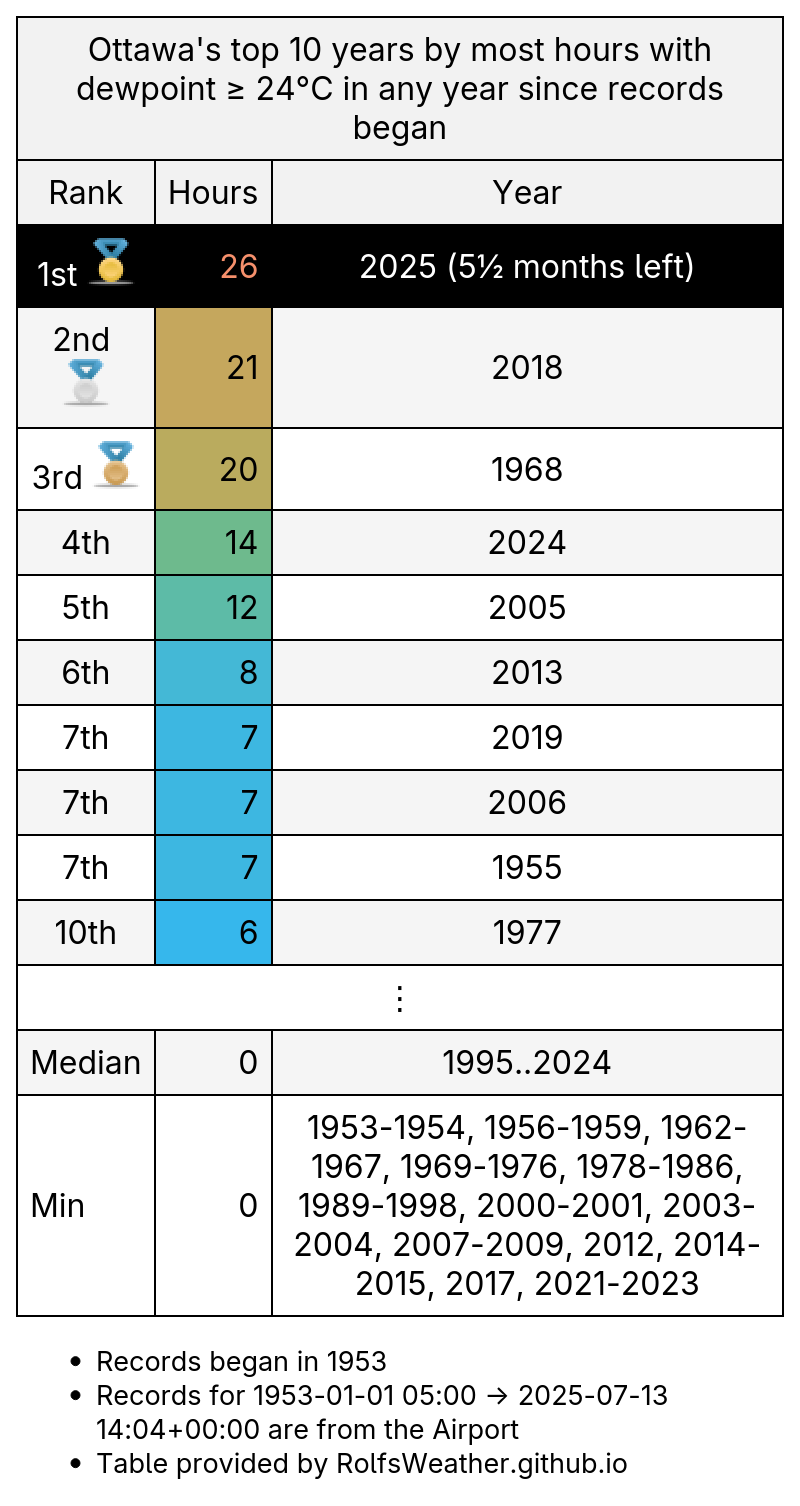 "content": "10am today was #Ottawa's 26th hour with dewpoint ≥ 24°C this year which puts 2025 in 1st place for the most in any year since records began. #YowWx #OttWeather #YOW #OttNews #ONWx\nhttps://assets.ottawa.place/media_attachments/files/114/846/307/849/585/958/original/1606250f1e230f89.png\n",