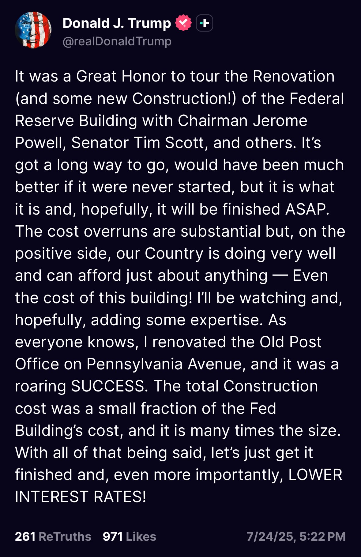 "content": "Trump issues a statement on his visit to the Fed HQ.\n\nBlasts renovation costs, says it \"would have been better if never started.\"\n\n“Let’s just get it finished and, even more importantly, LOWER INTEREST RATES!”\n\nhttps://cascdr-chads-stay-winning.nyc3.digitaloceanspaces.com/jamie-pro/226249/uploads/1753392920009-GwpyfksXsAA7PkW.jpg\n\nShared via https://pullthatupjamie.ai",