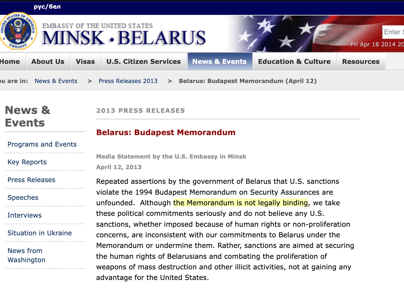 This is actually the easiest softball question in the world, at least for the Trump White House. The Obama-era U.S. State Department openly declared the Budapest Memorandum "not legally binding" in April 2013, roughly a year before Russia marched into Crimea. Team Trump fails yet again.
