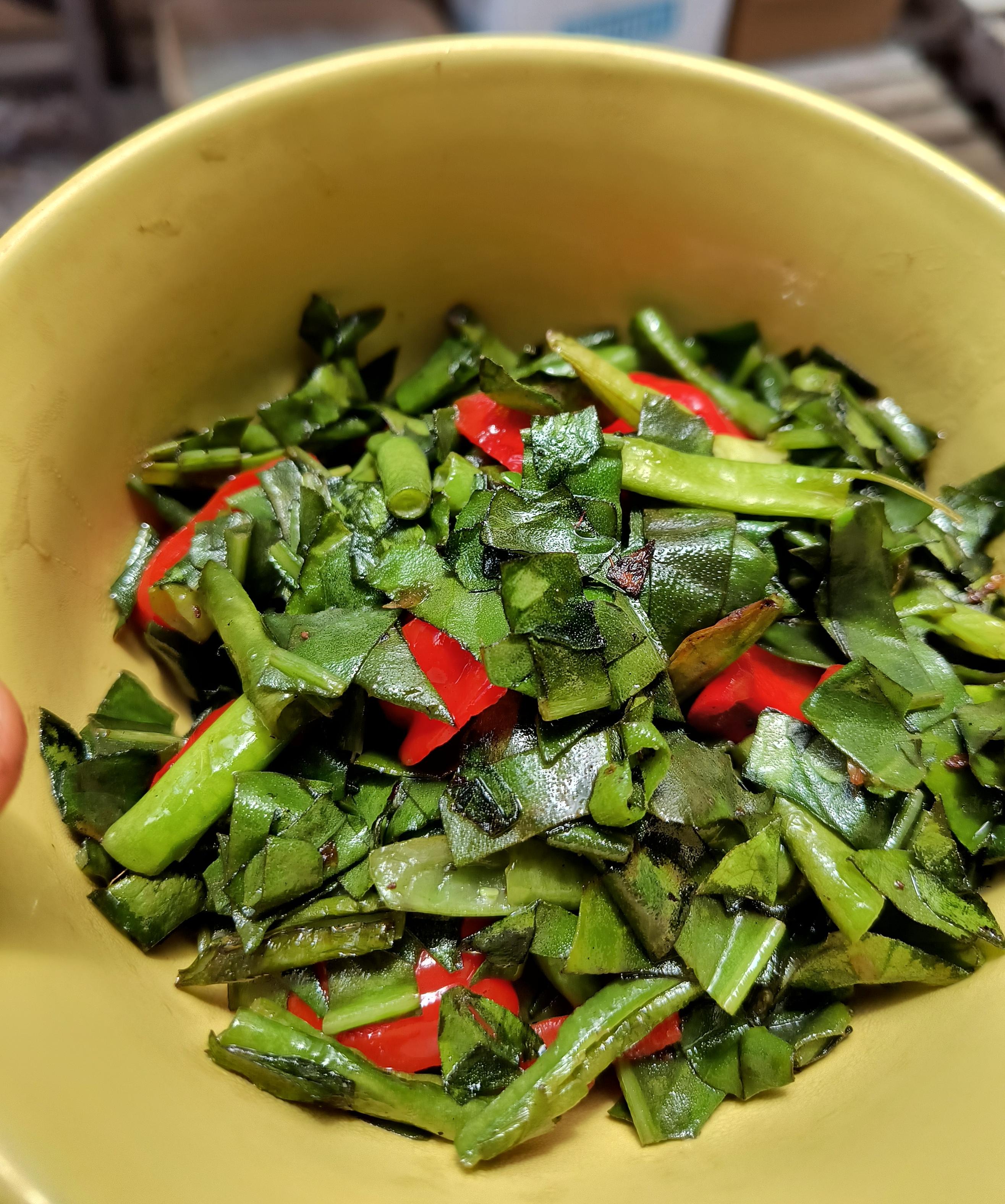 "content": "Veggie sautee with 100% garden veggies: long beans, sweet pepper, and Okinawa spinach (which grows incredibly well in our area and is a rich source of cooked green leaf veg).\n\nThis is the first time we've had my beloved long beans in years (the first year we lived here, we harvested them by the bucket and it was incredible). I'm saving the beans (and cooking the pods, which are soft and tasty) because this is exactly my favorite kind of bean and I don't want to repeat my previous mistake of letting them drop off. They are too delicious and nutritious!\n\nNow I just need a local source of cooking oil (there has to be a local coconut oil company, right? 🤔 There's local macadamia nut oil, but it's very $$$)...and an alternative to propane 😭 (I do have my solar cooker, but it doesn't fry - it steams, boils, bakes).\n\n#hawaii #growyourown #gardening #food #vegetarian\n\nhttps://regenerate.s3proxy.de/media_attachments/files/114/871/168/411/504/726/original/c7215ffc69d5c5b8.jpg",
