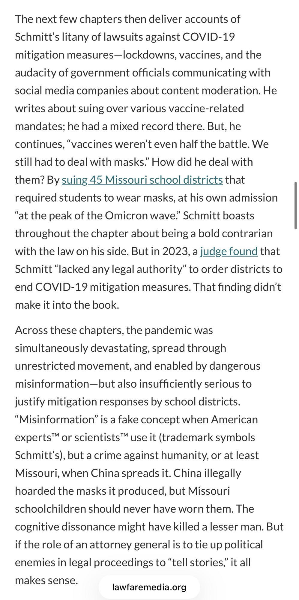 "content": "Read my article in Lawfare from Monday on the loser former AG/Senator of Missouri since it explains exactly this strategy: they care about framing and attention, not actual meaningful wins. \n\nwww.lawfaremedia.org/article/a-li...\n\nhttps://morel.us-east.host.bsky.network/xrpc/com.atproto.sync.getBlob?did=did:plc:5bnbgj7gwebt6hhub4pa5c7n\u0026cid=bafkreihzmlz3ab5mp3v66dxsg3flpnmhwy52rvnsagizp262qxssmqvu2u\nhttps://morel.us-east.host.bsky.network/xrpc/com.atproto.sync.getBlob?did=did:plc:5bnbgj7gwebt6hhub4pa5c7n\u0026cid=bafkreienhtf24fs2m52nj6v4cg7v2sir5fdbyrenowk2d2a6hfsiuqetaa",