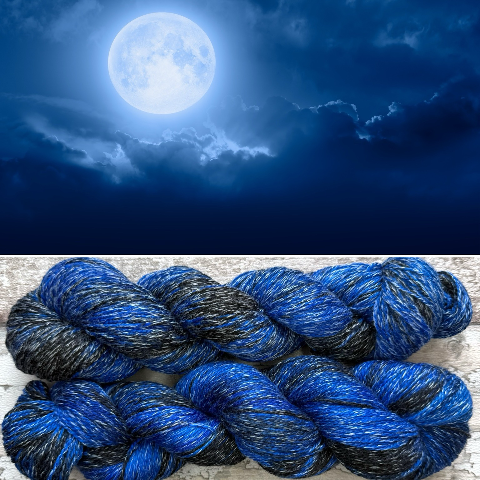 "content": "Moonlit Sky. A variegated mix of rich blues and dark black, beautiful and deep, like the moonlit sky. I created this effect using dyes that bind to the wool but not the cotton for beautiful glints of white moonlight throughout the skein. It is suitable for socks. #mothyandthesquid #knitting #crochet #yarn mothyandthesquid.com 🧶\n\nhttps://files.glasgow.social/media_attachments/files/114/074/981/205/300/473/original/7e858081f67a618d.png",