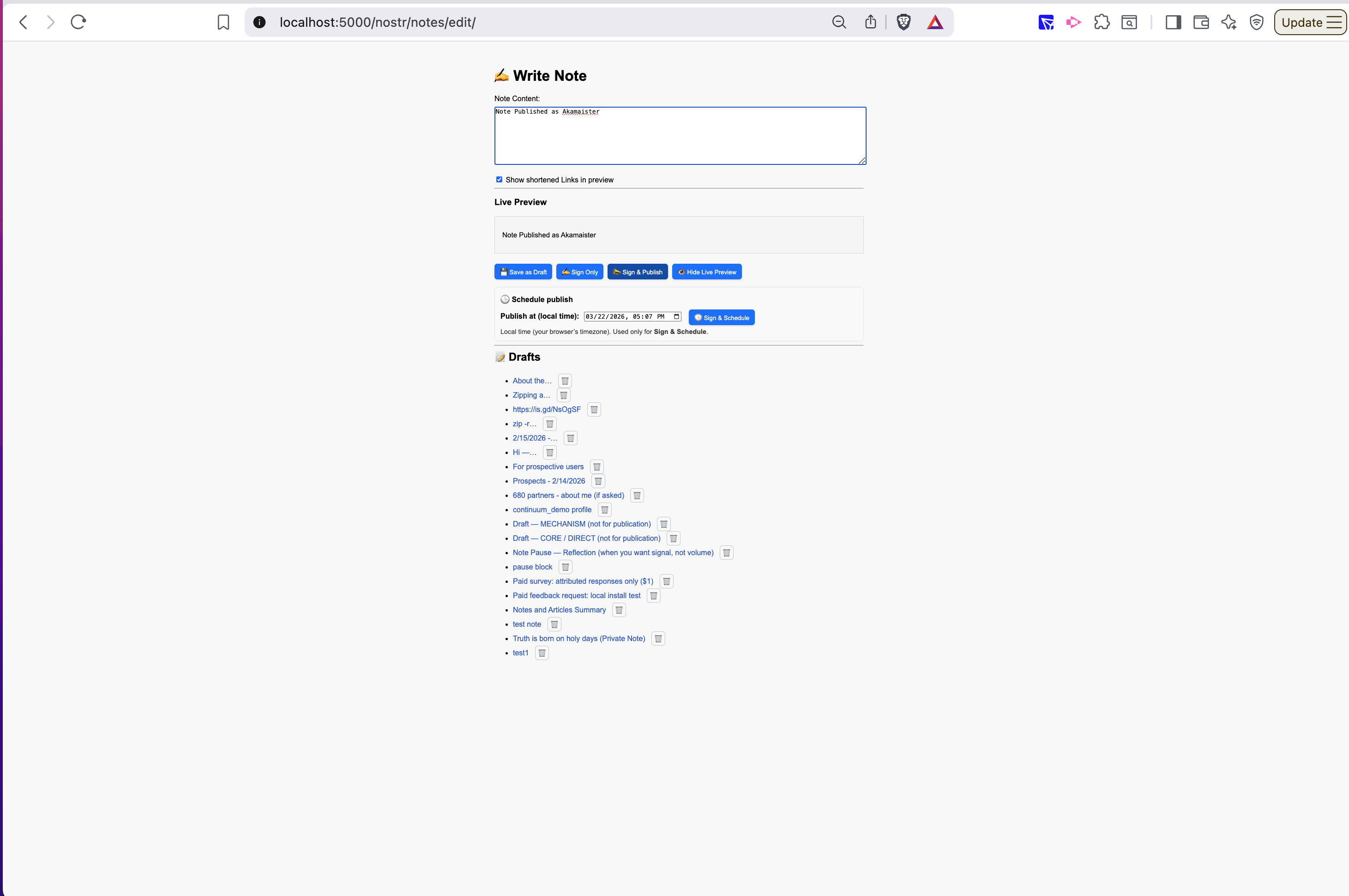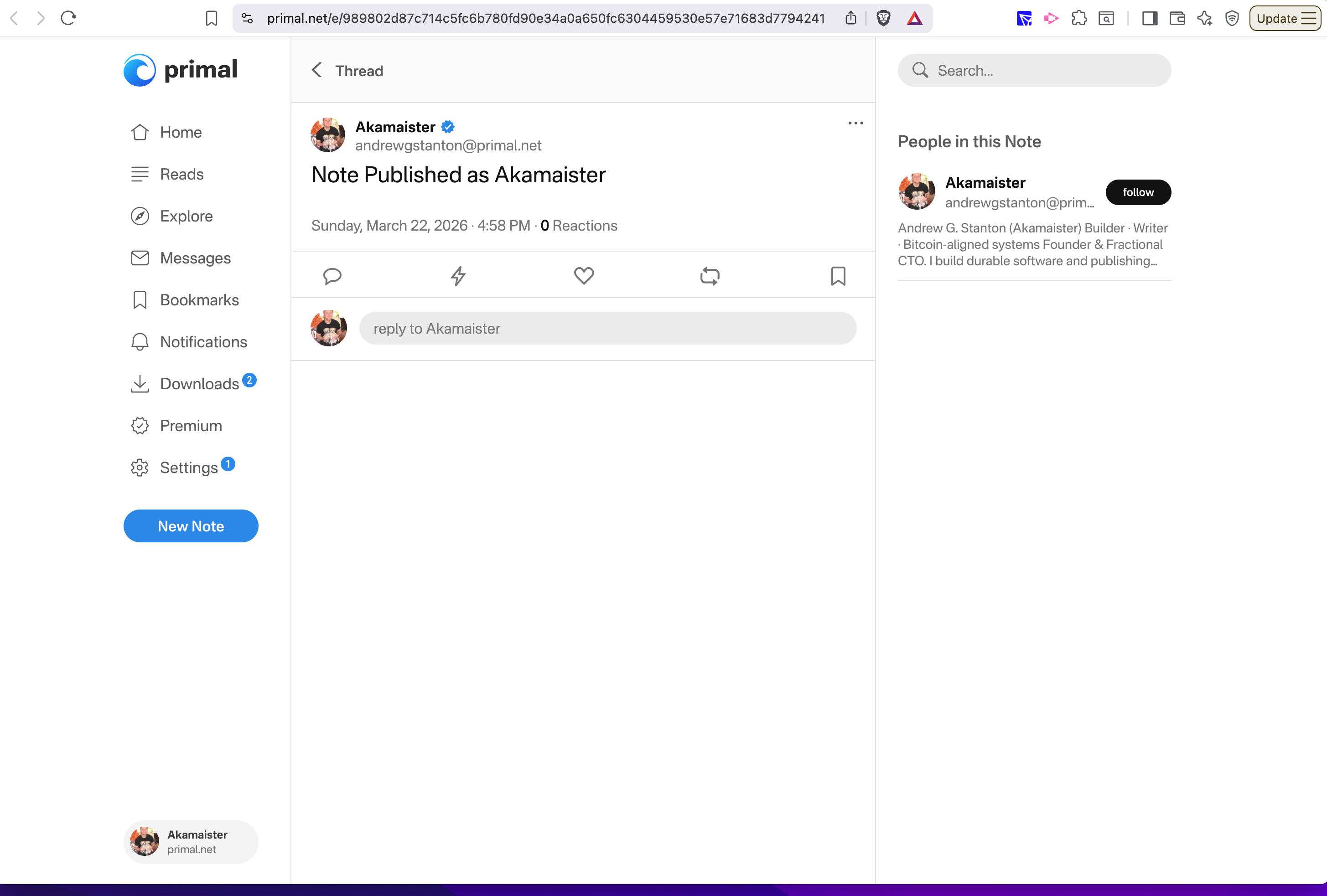 This is a real example of creating and publishing notes using multiple identities in a single session — no login/logout, no account switching.